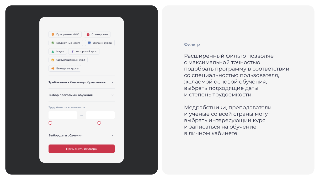 Расширенный фильтр позволяет с максимальной точностью подобрать программу в соответствии со специальностью пользователя, желаемой основой обучения, выбрать подходящие даты и степень трудоемкости.