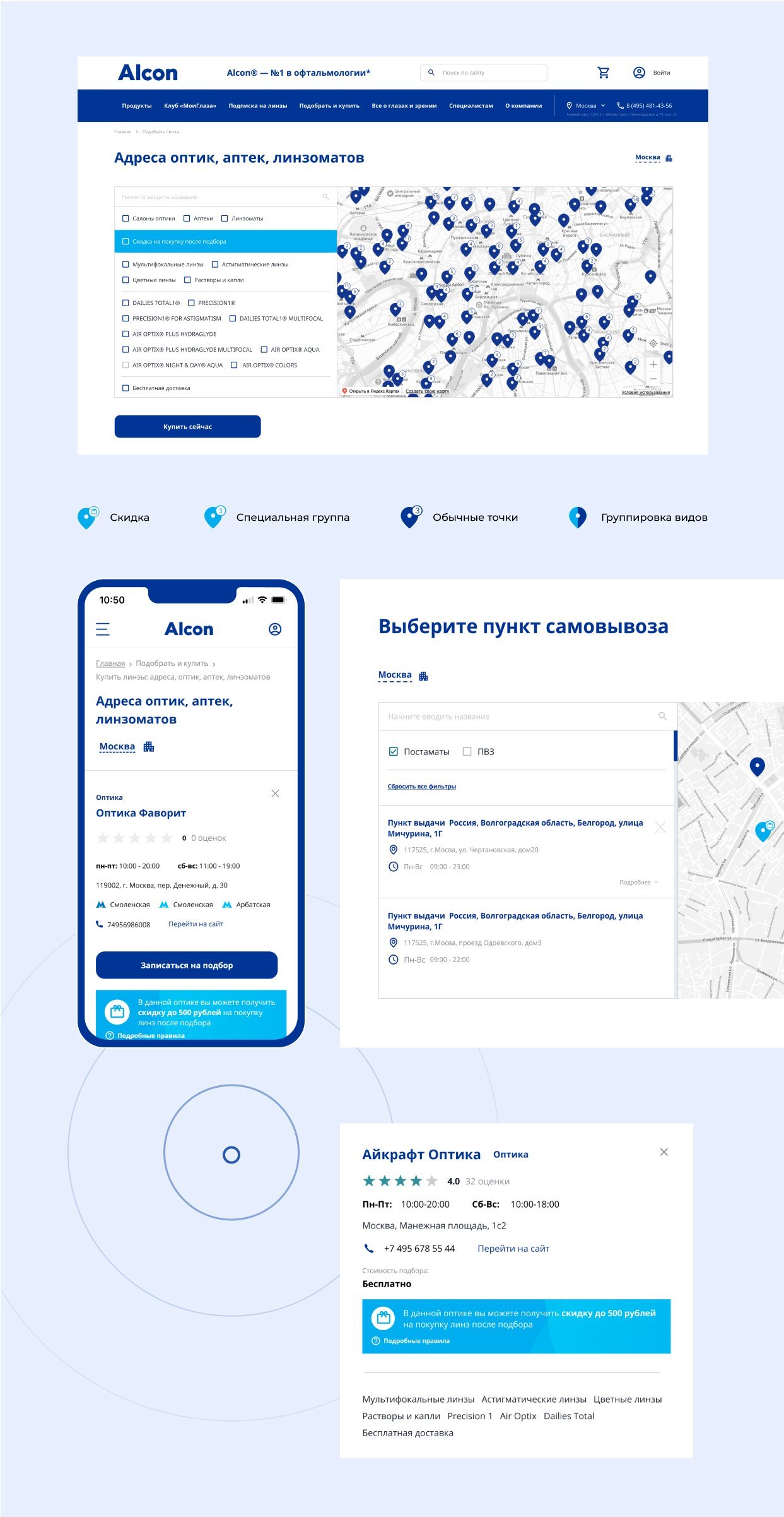 Автоматизировали выведение партнерских оптик на интерактивную карту с указанием адреса, специализированных услуг и наличия продуктов в каждом конкретном салоне. Создали систему онлайн-записи для подбора и покупки товаров в оптиках. Предоставили возможность самостоятельно выводить свои салоны на витрину в качестве пунктов выдачи заказов с сайта