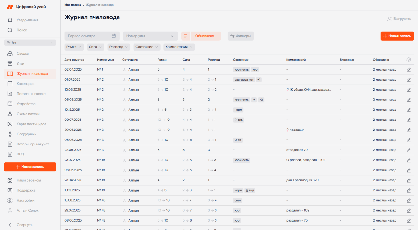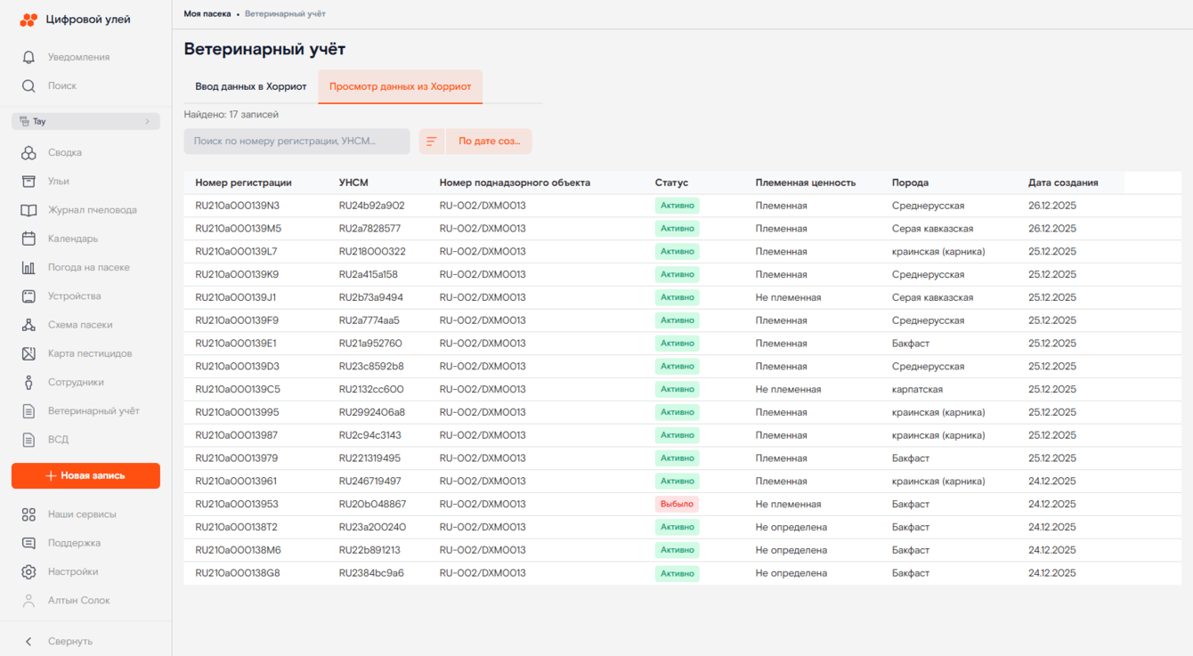 – Система учета ульев и пасек; проведение ветеринарного учета; проведение ветеринарных мероприятий; напоминания о необходимости проведения вет. мероприятий. Интегрировано с ФГИС Хорриот.
