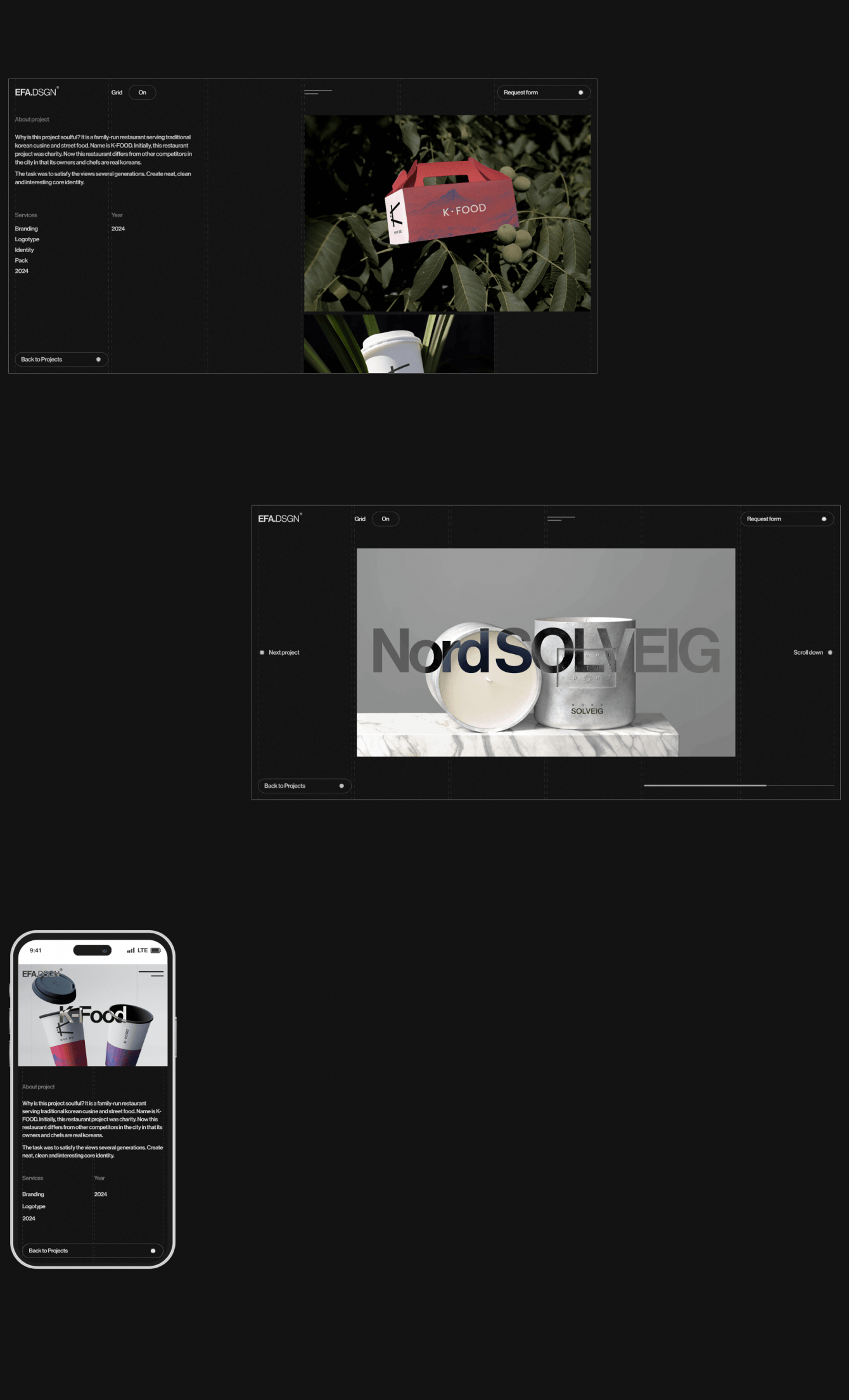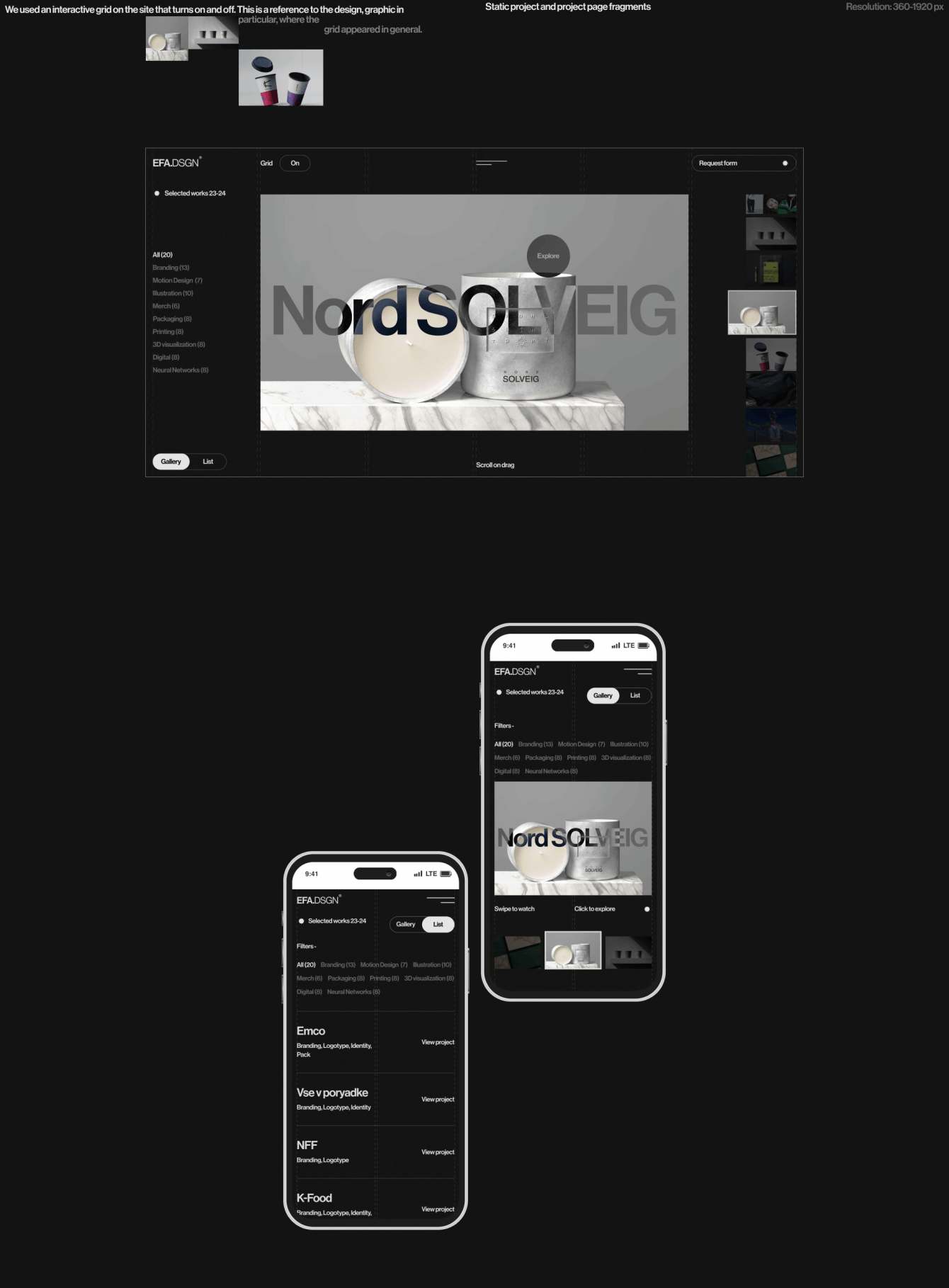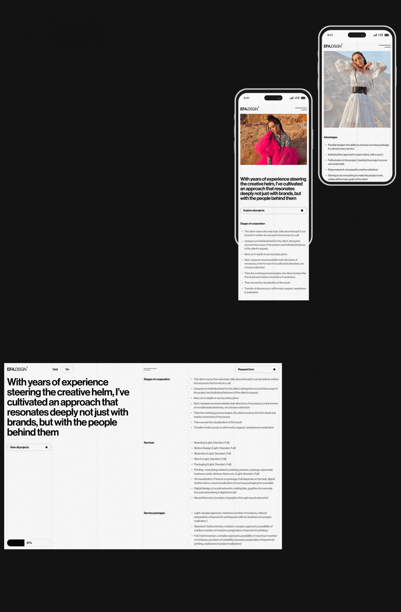 Проект —чистая эстетика. Так еще и судья самый строгий, потому что в дизайне шарит и имеет свой стиль и взгляд на сферу в целом. Погнали смотреть, насколько мы справились (спойлер — на все 100). Итак, мы разработали дизайн сайта EFA.DSGN. Клиент предоставил нам полный карт-бланш. Делайте, мол, что хотите, чтобы получилось заебись. Ну, вроде с ТЗ мы справились. Проект выполнен в стиле минимализма с вкраплением элементов брутализма, чтобы показать, что дизайнер работает с разноплановыми задачами, в том числе нестандартными. Использовали интерактивную сетку на сайте, которая включается и выключается. Это отсылка к дизайну, графическому в частности, где вообще сетка и появилась.