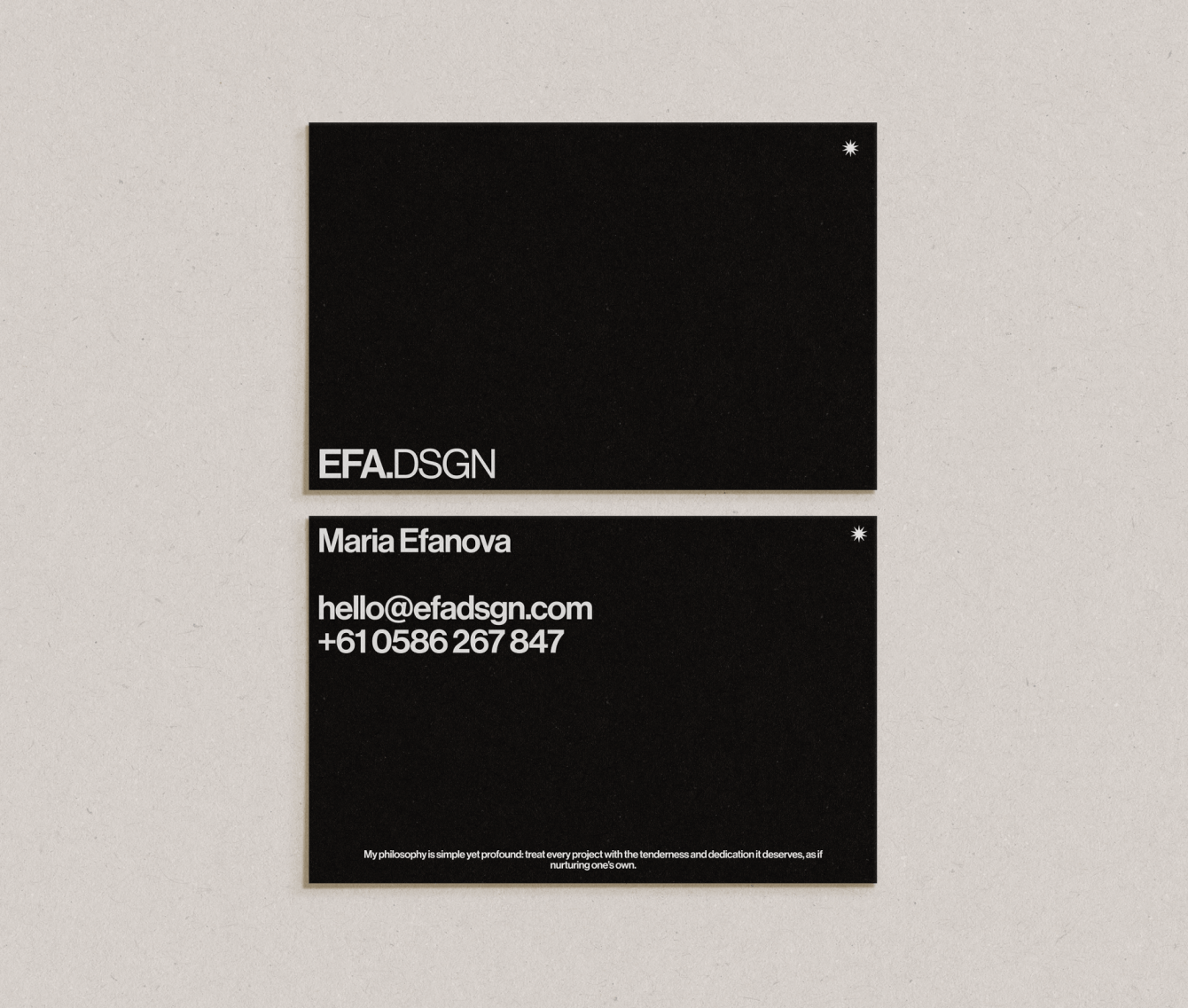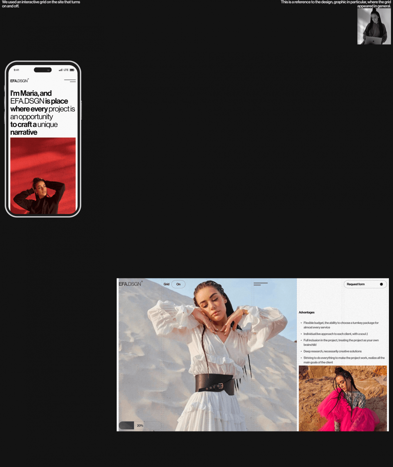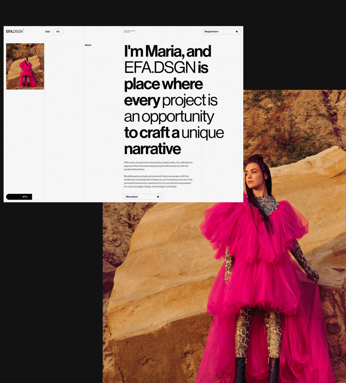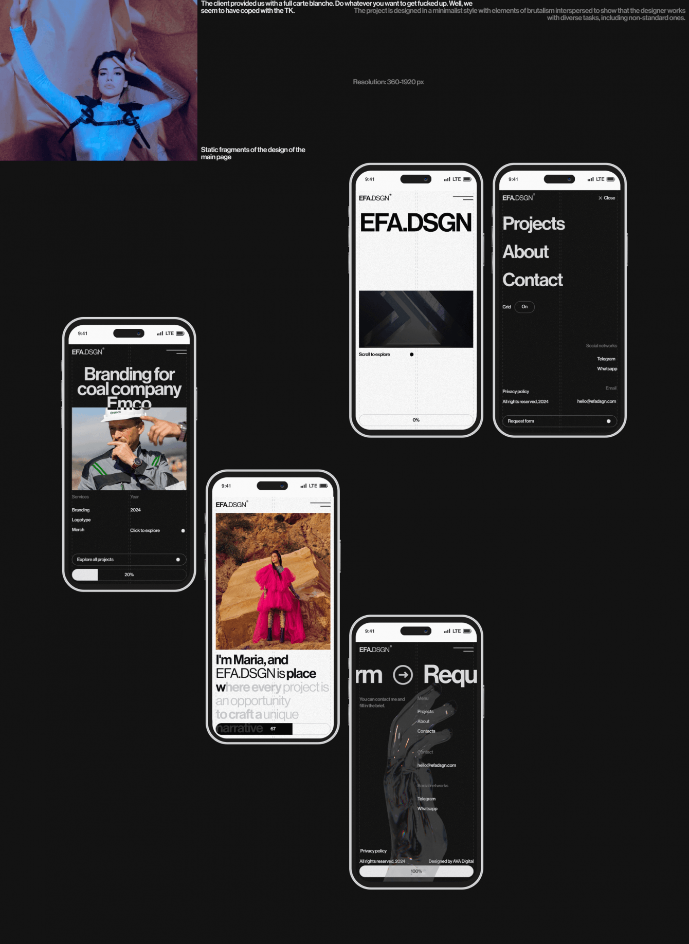 Проект —чистая эстетика. Так еще и судья самый строгий, потому что в дизайне шарит и имеет свой стиль и взгляд на сферу в целом. Погнали смотреть, насколько мы справились (спойлер — на все 100). Итак, мы разработали дизайн сайта EFA.DSGN. Клиент предоставил нам полный карт-бланш. Делайте, мол, что хотите, чтобы получилось заебись. Ну, вроде с ТЗ мы справились. Проект выполнен в стиле минимализма с вкраплением элементов брутализма, чтобы показать, что дизайнер работает с разноплановыми задачами, в том числе нестандартными. Использовали интерактивную сетку на сайте, которая включается и выключается. Это отсылка к дизайну, графическому в частности, где вообще сетка и появилась.