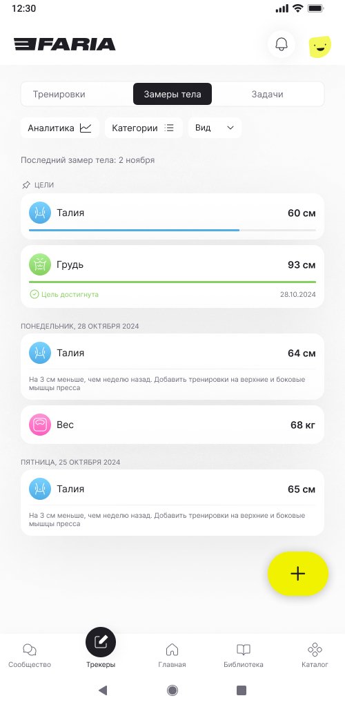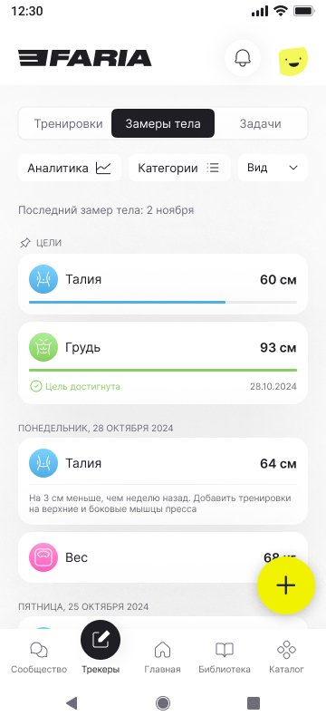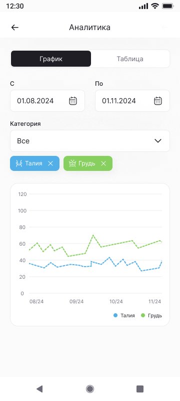 измерять параметры тела (вес, объёмы) и визуализировать динамику прогресса на графиках;