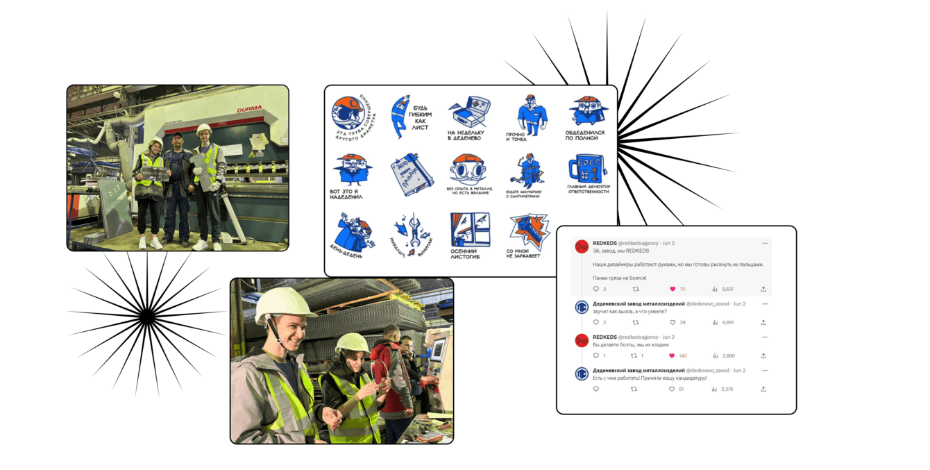 Счастливчиками стали дизайнеры из креативного агентства REDKEDS. Они заявили, что «панки грязи не боятся», и мы поняли, что перед нами победитель. Организовали стажировку для двух дизайнеров, задокументировали каждый их шаг на заводе, рассказали об этом в статье на vc.ru, а они в знак благодарности нарисовали для завода стикеры. В результате получили 1,7 млн охвата и фирменный стикерпак.