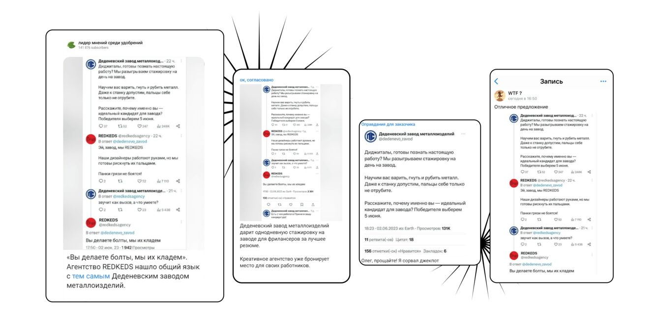 — Сделали из обычного подмосковного завода звезду соцсетей — бесплатно получили 50+ анонсов в крупнейших отраслевых тг-каналах с упоминанием «тот самый завод» («лидер мнений среди удобрений», «эсэмемное чтиво», «Гусь», «ок, согласовано», «Оправдания для заказчика», «Сосисочная», «Алло, Галочка, ты не поверишь!», «Беспощадный банкстер», «Лента Дня», «Бульварное Кольцо», «Это Москва» и других).