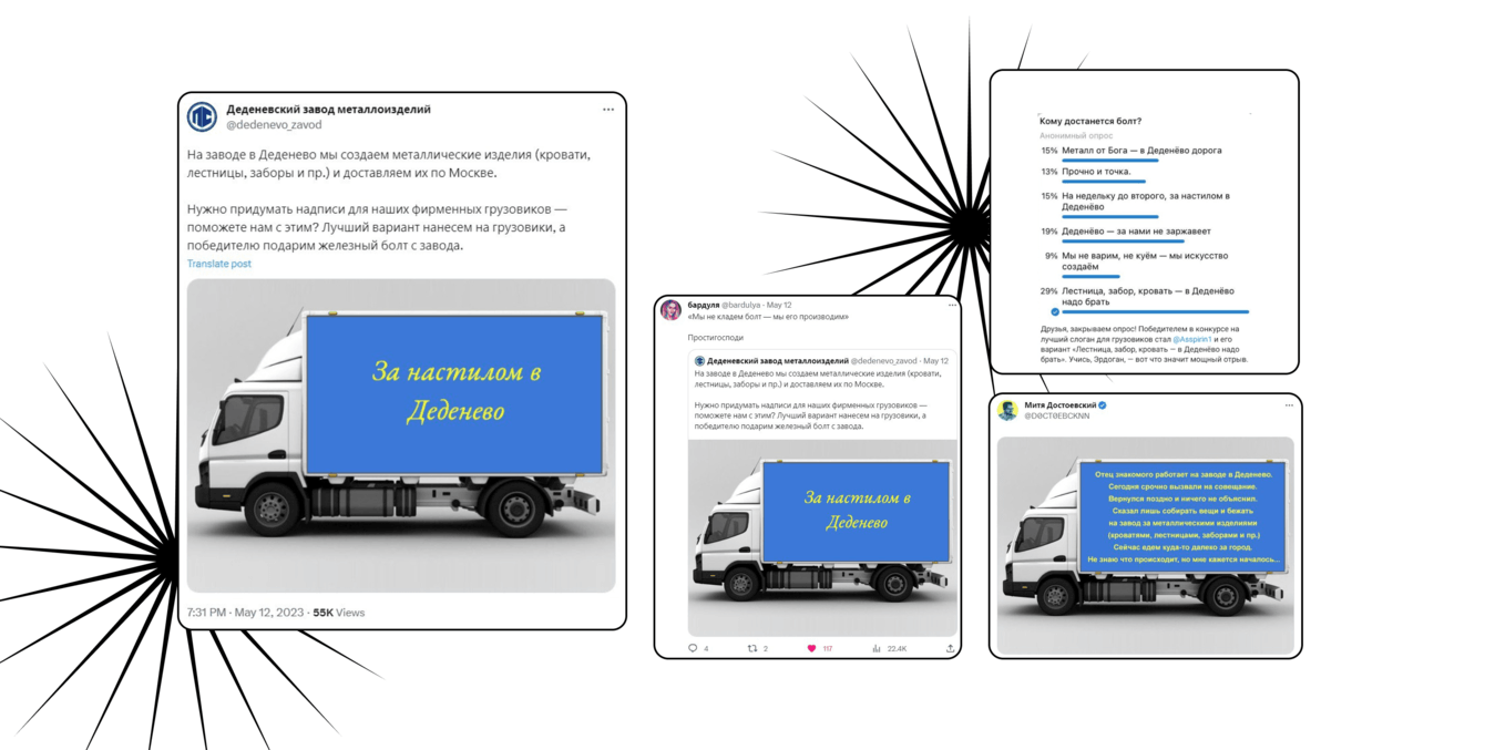 У ДЗМ есть грузовики, на которых они развозят металлоизделия по Москве и области. Клиент хотел обклеить их броскими баннерами, которые бы цепляли взгляд и запоминались прохожим. Мы решили сделать из этой задачи вирусный креатив и запустили конкурс в Twitter с бюджетом 10 000 рублей.