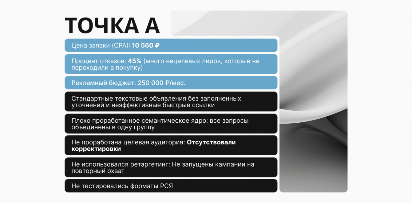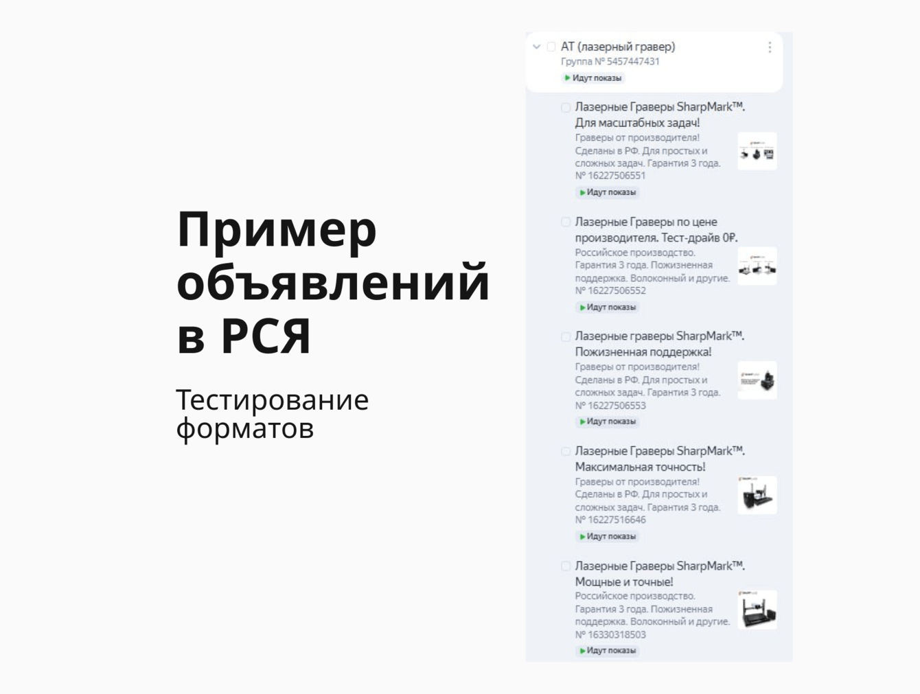 Запуск рекламы в РСЯ с использованием различных форматов и текстов позволил протестировать разные подходы и выяснить, какой контент лучше воспринимается целевой аудиторией.