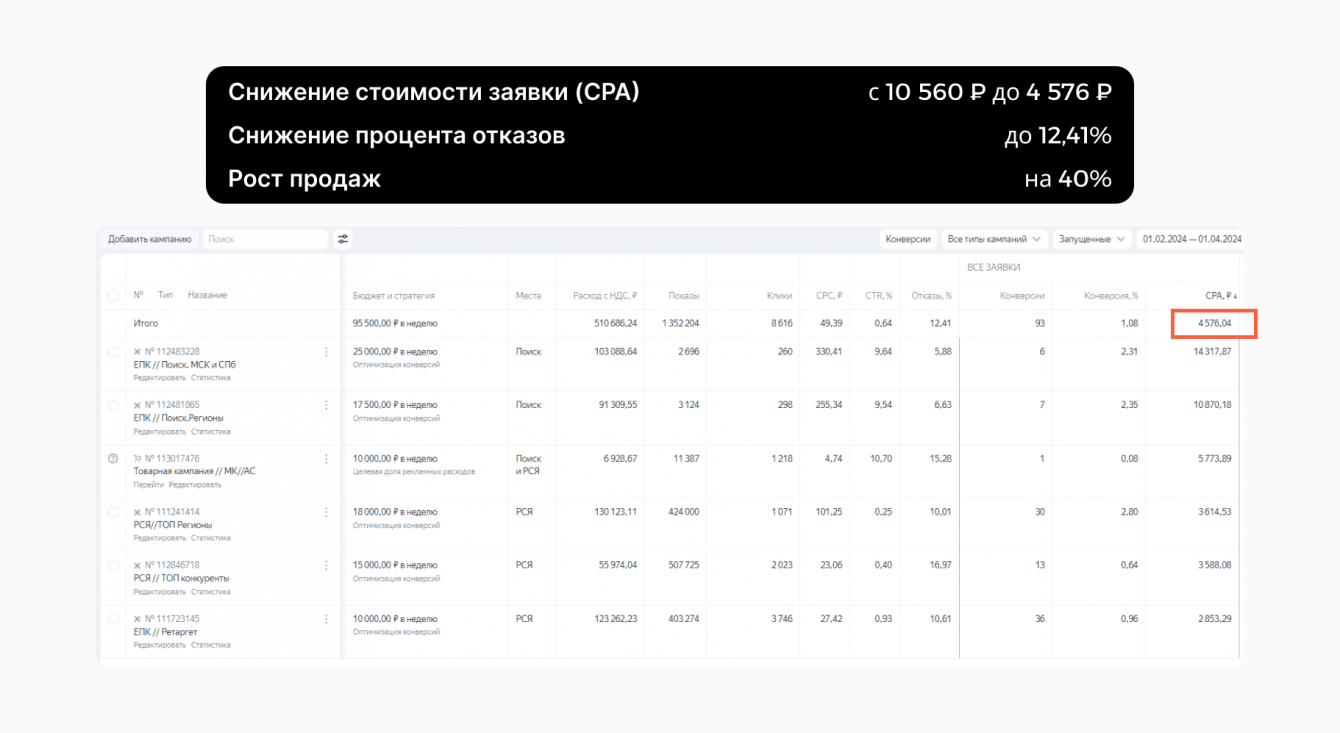 - Снижение стоимости заявки (CPA): С 10 560 ₽ до 4 576 ₽
