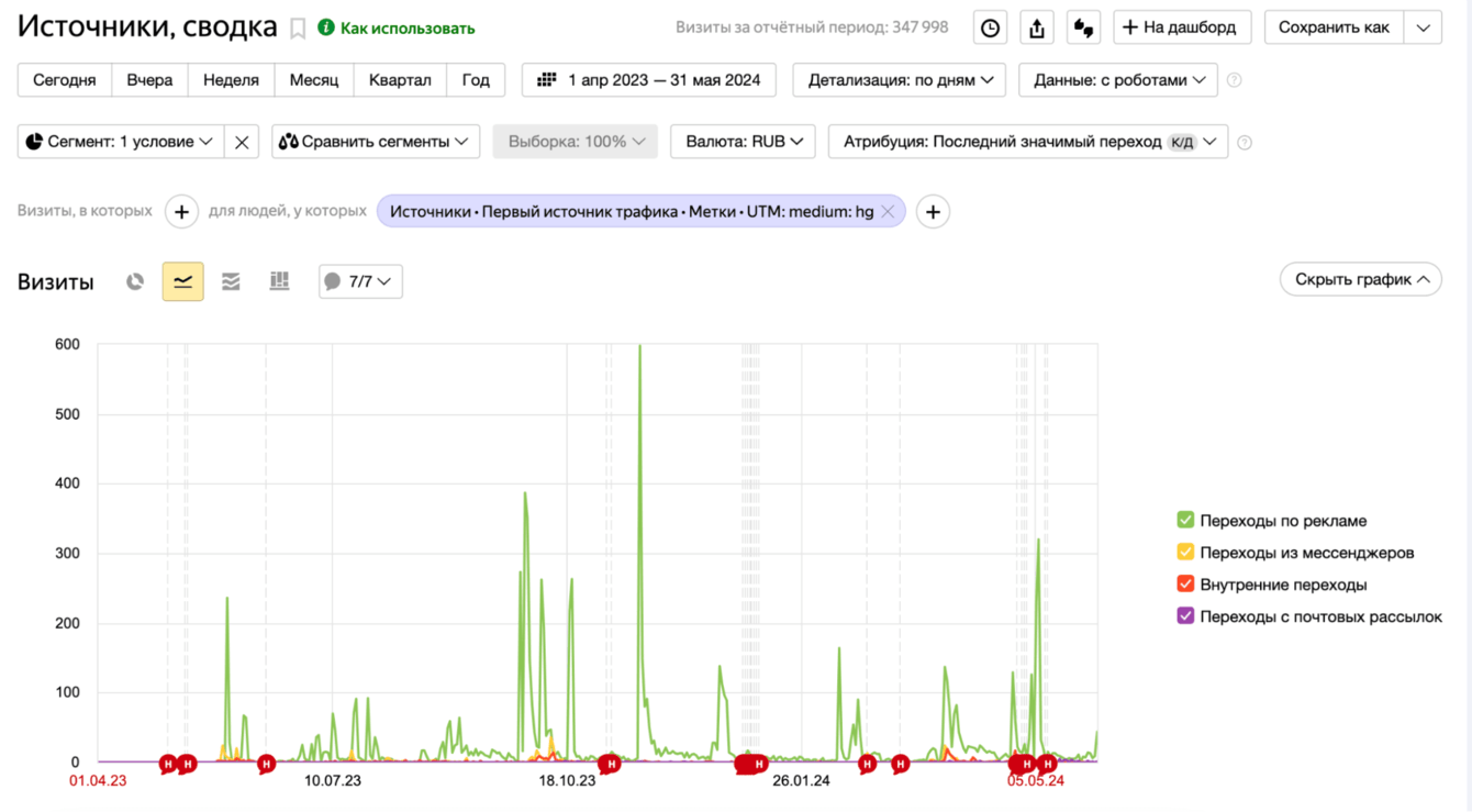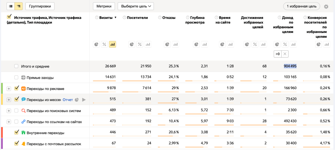 Во-вторых, можно сформировать отчет “Источник-сводка”, создать сегмент по посетителям меток от блогеров и отследить, сколько продаж получено в итоге от трафика с метками от нашей рекламы у блогеров