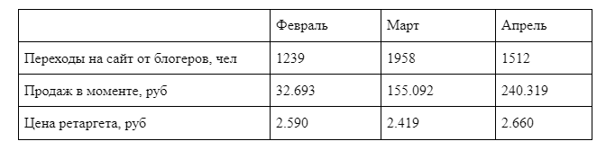 Когда количество трафика от блогеров порядк 1200 человек, продажа с ретаргета стоила около 2600 руб;- когда трафика от блогеров стало 2000 человек, продажа с ретаргета стала стоить 2400 руб;