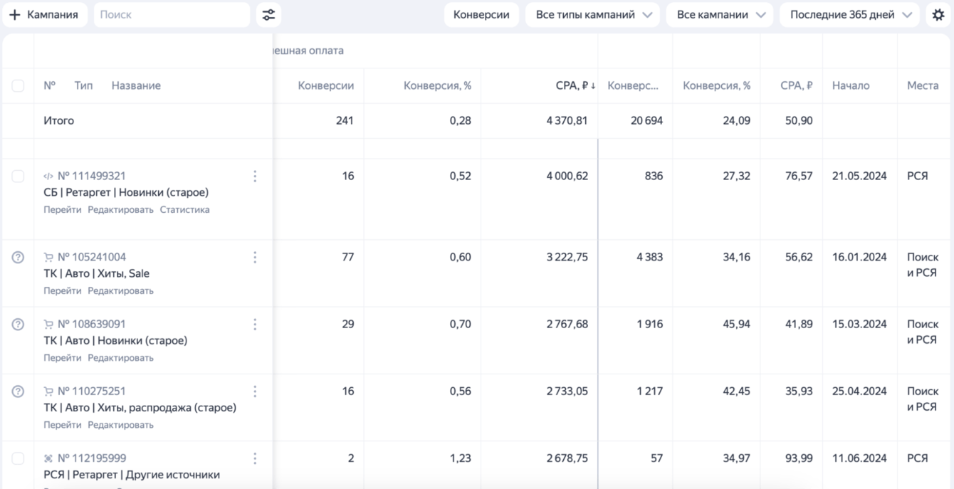 И далее можно оценить, сколько стоит конверсия “Покупка” по рекламному кабинету по таким аудиториям, что не будет результатом только ретаргета с канала инфлюенса, при этом оценка зависимости от трафика блогеров будет очевидна: смотрите по скрину ниже