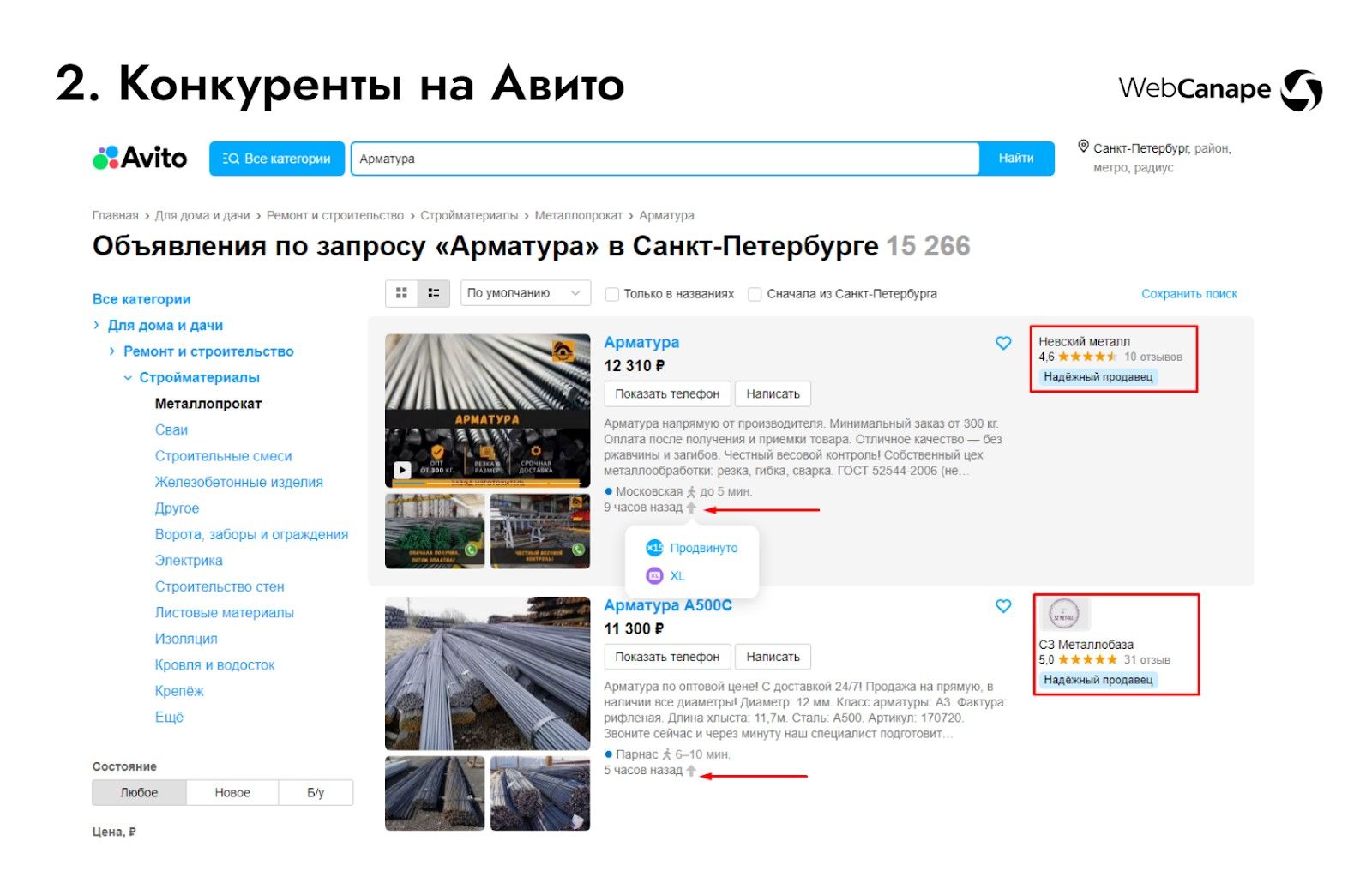 Конкуренты на «Авито» есть. Предложений стройматериалов больше от компаний, чем от частных лиц, и они используют платное продвижение.