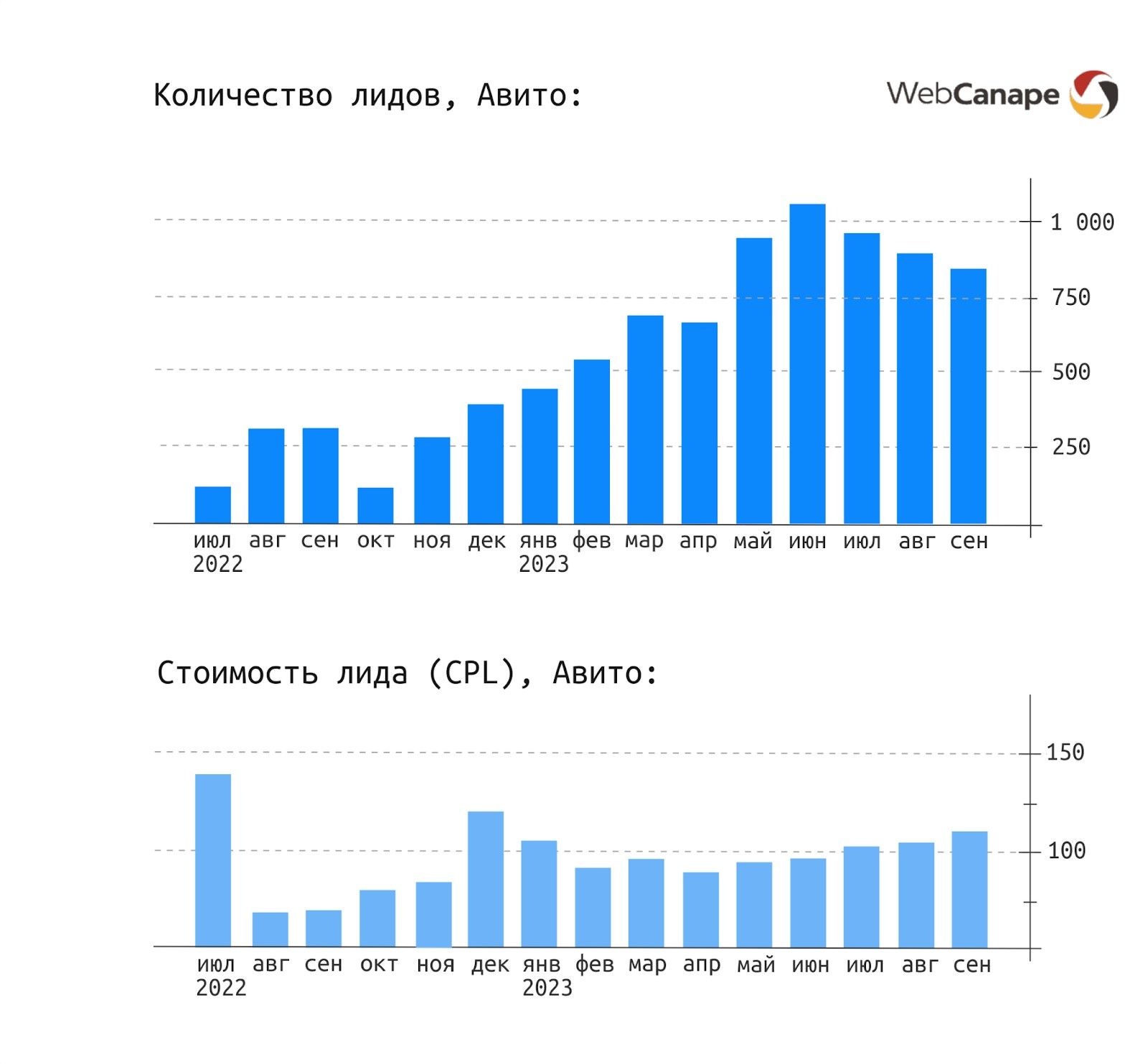 Количество лидов с «Авито» по месяцам и стоимость лида отражены на графике.