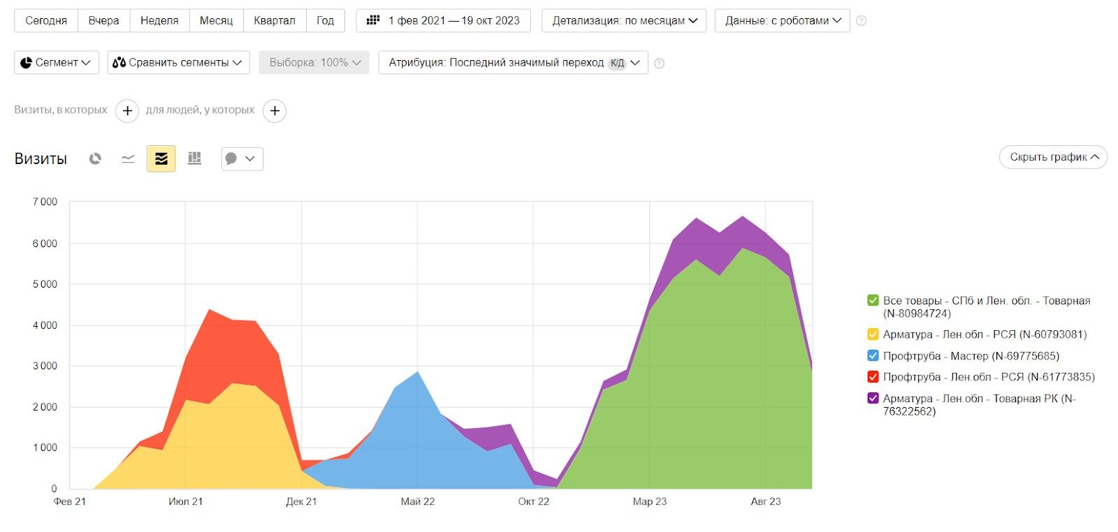 - В ноябре 2022 года реализовали товарные кампании, ставшие основным источником трафика. Кампании автоматически показывали товары из каталога на площадках Яндекса.
