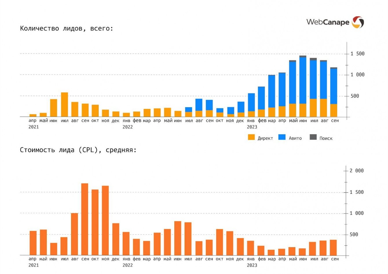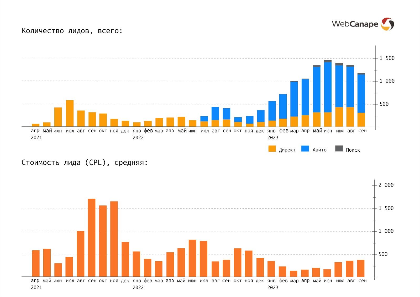 4. После оценки внешних площадок выбрали «Авито». Мы увидели потенциал и проверили гипотезу. Но результат превзошел наши ожидания, сейчас этот канал занимает самую большую долю в объеме полученных лидов и продаж клиента.