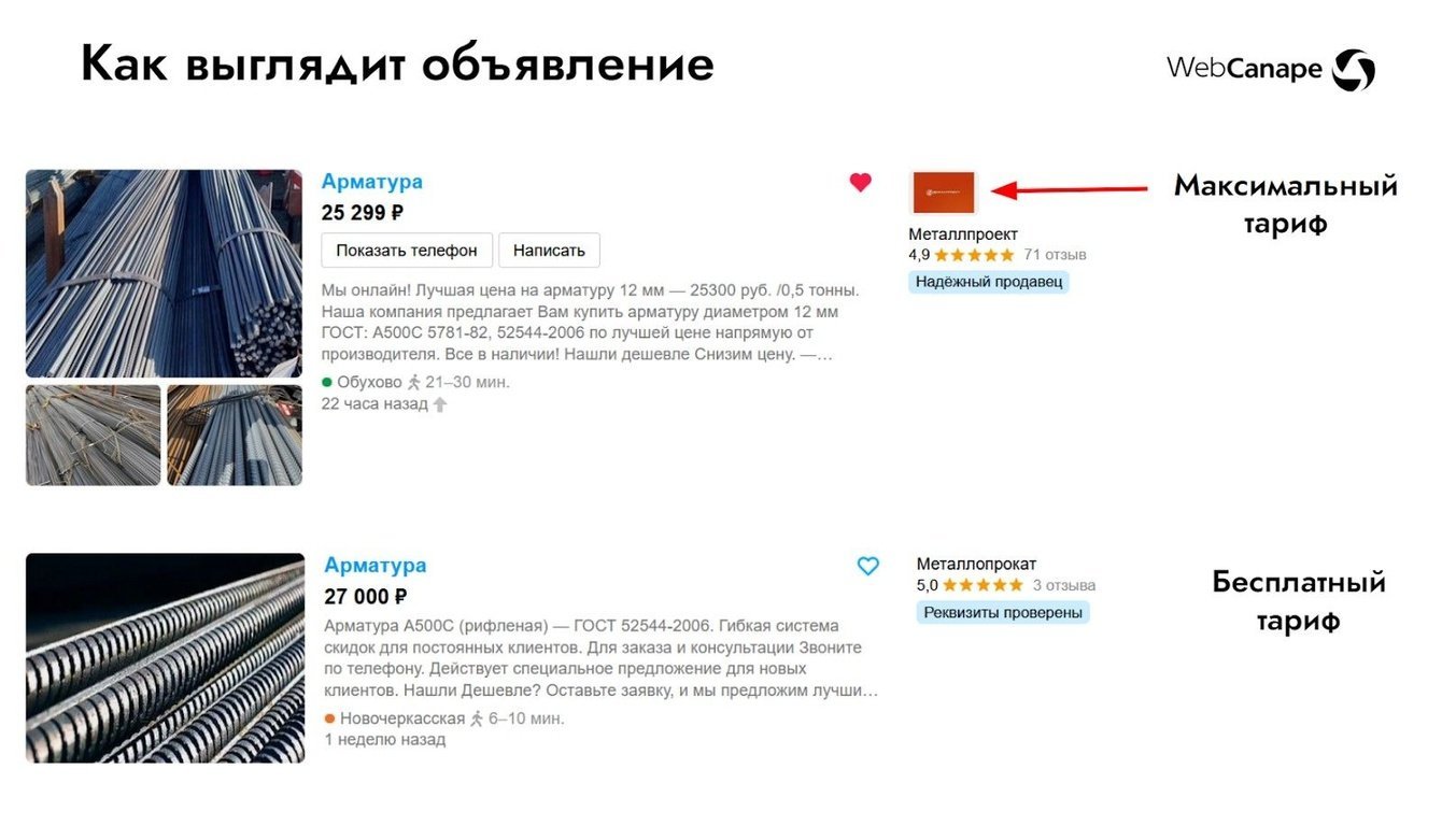 1. В рекомендациях при открытии объявления компании на максимальном тарифе площадка показывает наши предложения, а на бесплатном тарифе в рекомендациях предложения конкурентов.