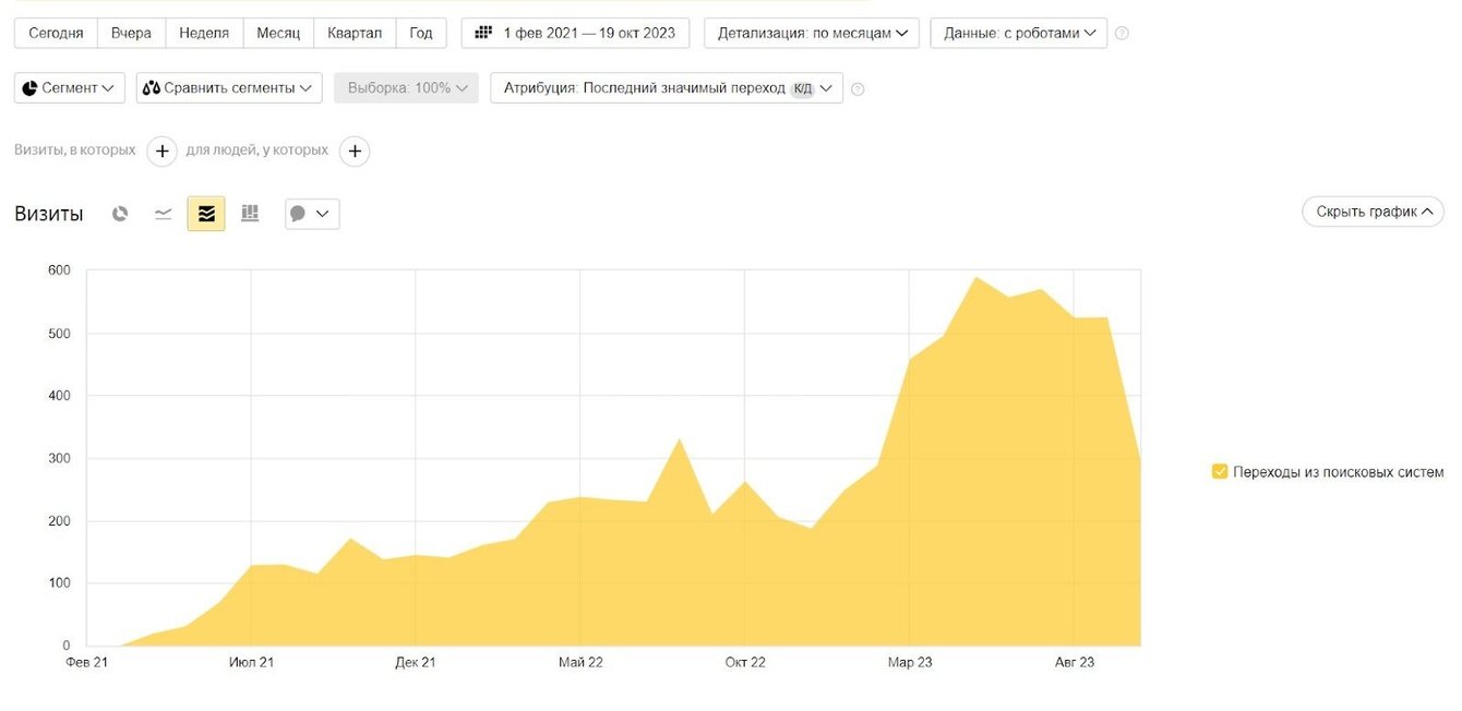 Но даже базовые работы дали результат, трафик вырос с 150-200 посетителей в месяц до 450-500. Увидели, что у поискового продвижения есть потенциал и с октября 2023 начали полноценное SEO.
