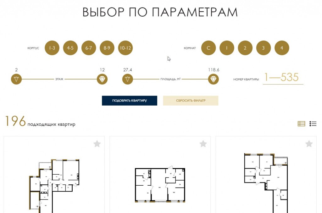 — разработка функционала выбора квартиры, который представлен не только в стандартном виде каталога, но и в более наглядном интерактивном варианте;