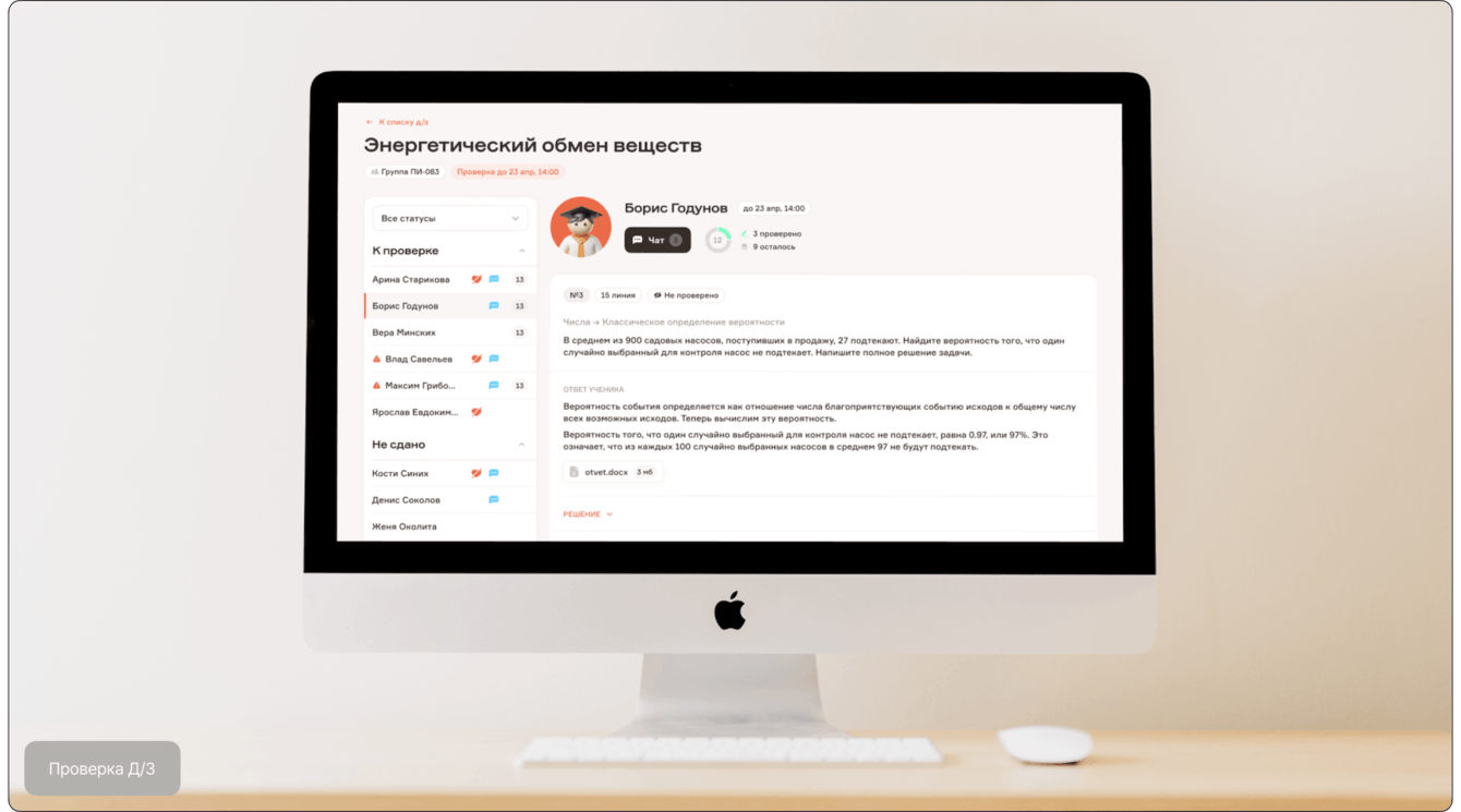 Интерфейс проверки удобен и функционален. Слева расположен список учеников, разделённых по статусам: «к проверке», «не сдано», «завершено». Индикаторы показывают сообщения в чате, просроченные задания и потерянные «жизни». Потерянные жизни сигнализируют, что ученик испытывает трудности и нуждается в помощи.