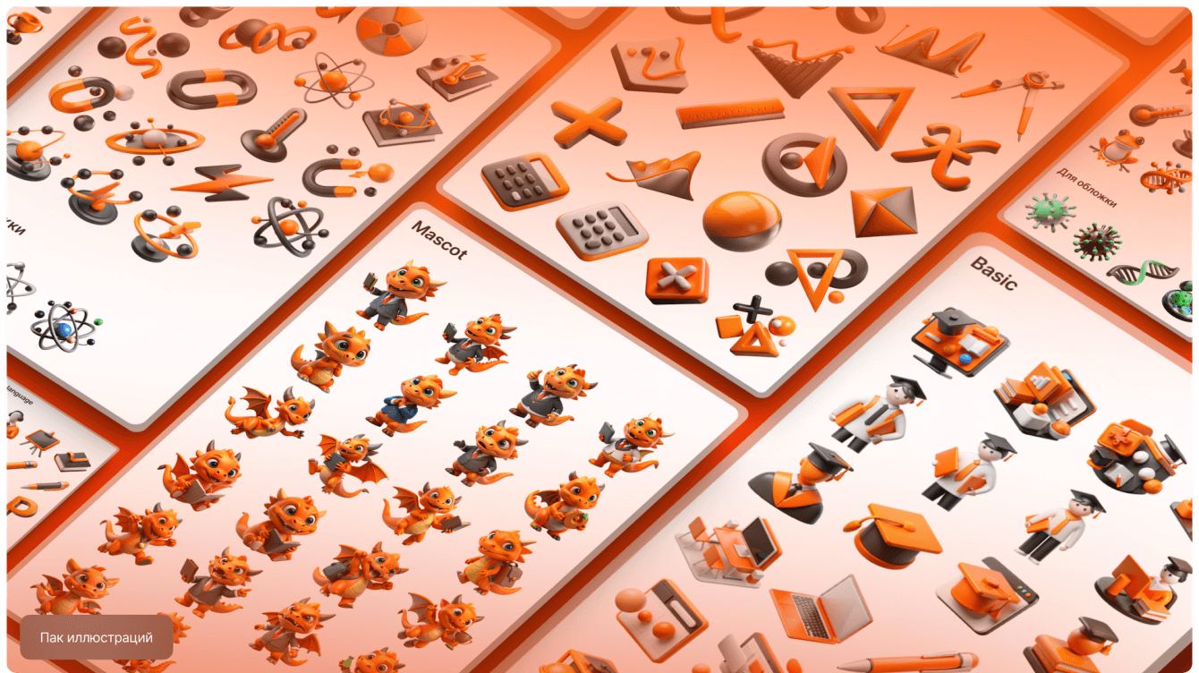 - Создали пакет иллюстраций: с помощью нейросетей разработали набор маскотов с разными образами, предметные иконки и базовые иллюстрации.