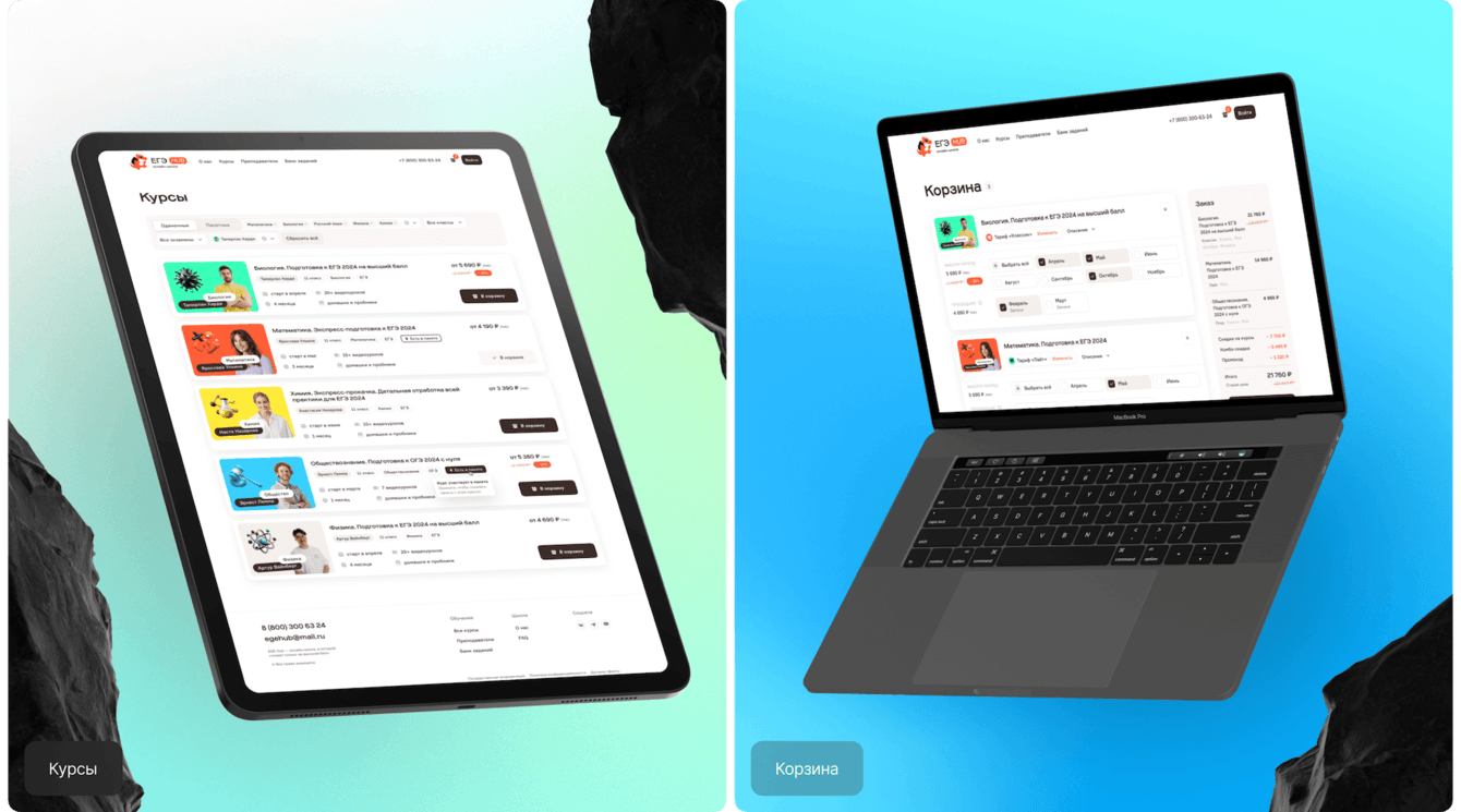 Мы спроектировали карточку курса со сложным интерфейсом, где показали матрицу выбора периода, условия покупки, тарифы, цены со скидкой и без, а также поле для промокода. В результате процесс выбора и оформления курсов стал удобным и понятным для пользователя.