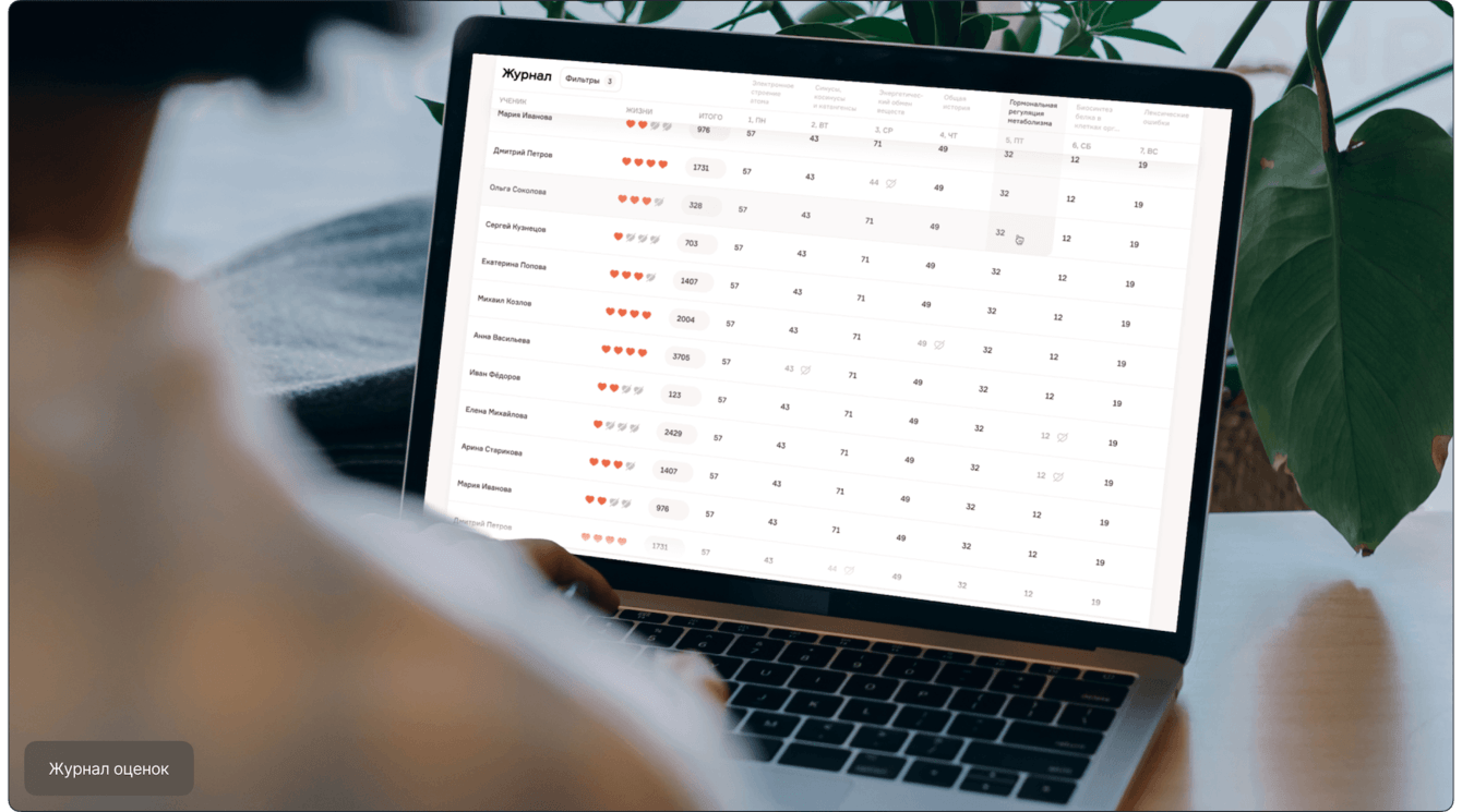 Журнал оценок представлен в виде сводной таблицы по ученикам, темам домашних заданий, баллам и «жизням». Куратор может выбрать список учеников по курсу, группе или периоду. В журнале он просматривает успеваемость всей группы, выявляет темы, которые вызывают сложности, и определяет, каким студентам материал даётся тяжело.