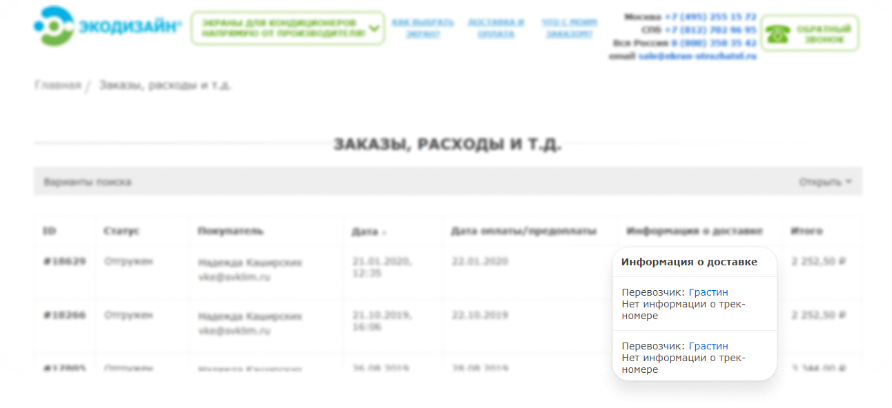 Покупателям интернет-магазина было неудобно отслеживать доставку груза. Мы добавили в список заказов раздел с информацией о службе доставки и подгрузку трек-номера, если он доступен. Название службы доставки кликабельно — можно перейти на сайт и узнать, где находится груз.