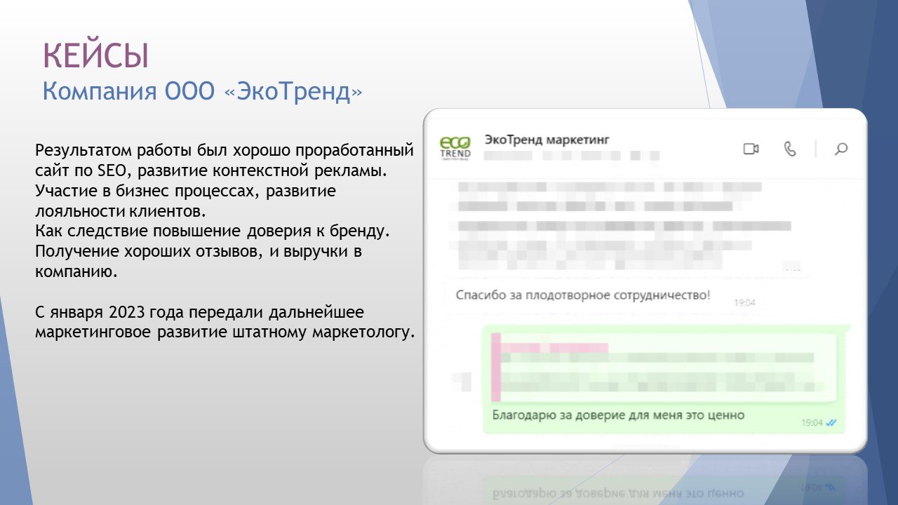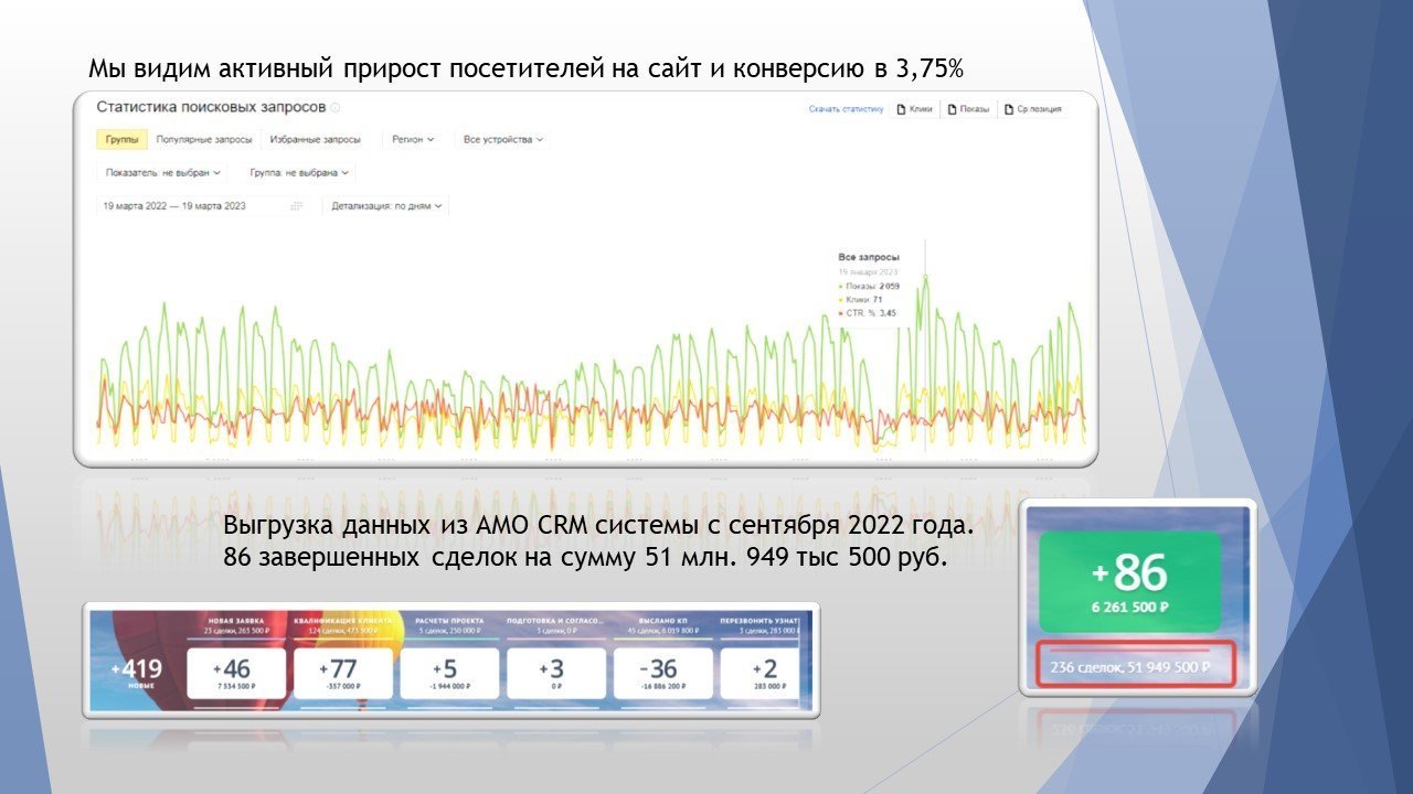 В результате проекта разработан и адаптирован сайт к поисковым системам на Яндекс и Гугл. Адаптация и внедрение маркетинговой стратегии в бизнес. Повышен индекс узнаваемости и лояльности к бренду. Поднятие выручки компании в х2 раза