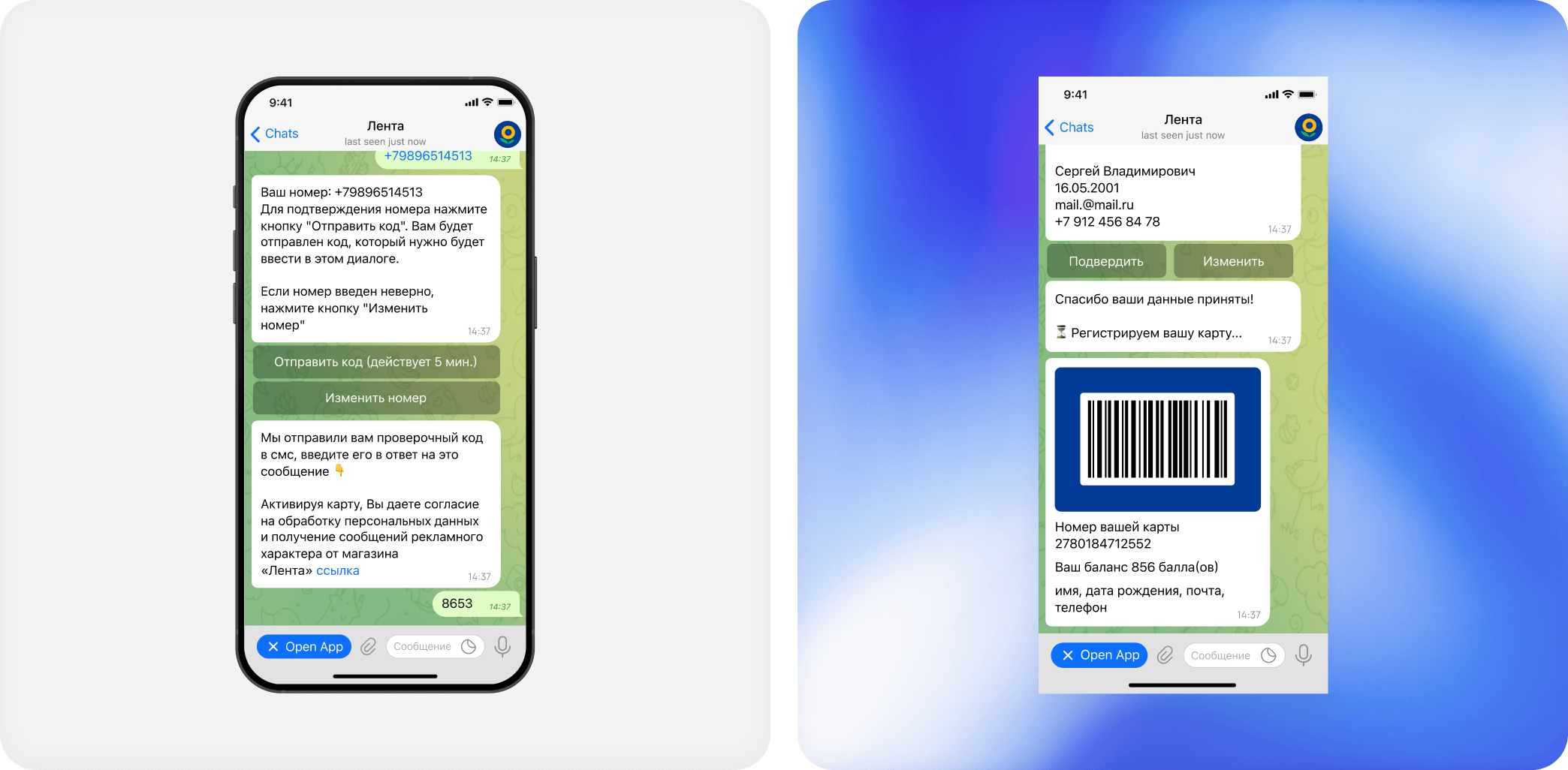Регистрация новых пользователей и авторизация проходит через разработанный чат-бот. После регистрации данные пользователя (в том числе номер телефона) сохраняются в базу, и к нему привязывается бонусная карта для онлайн-покупок.