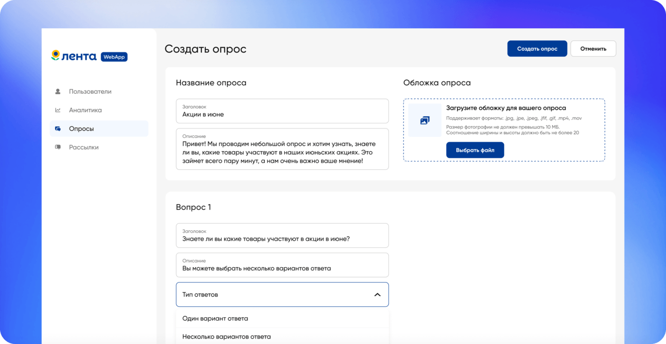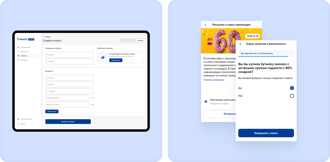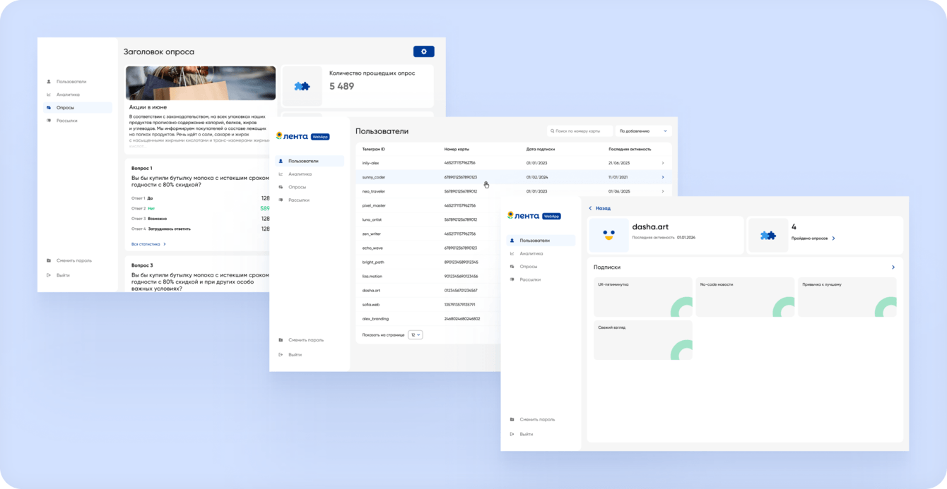 Для управления рассылками, опросами и данными пользователей (username и номер карты клиента), мы разработали административную панель.