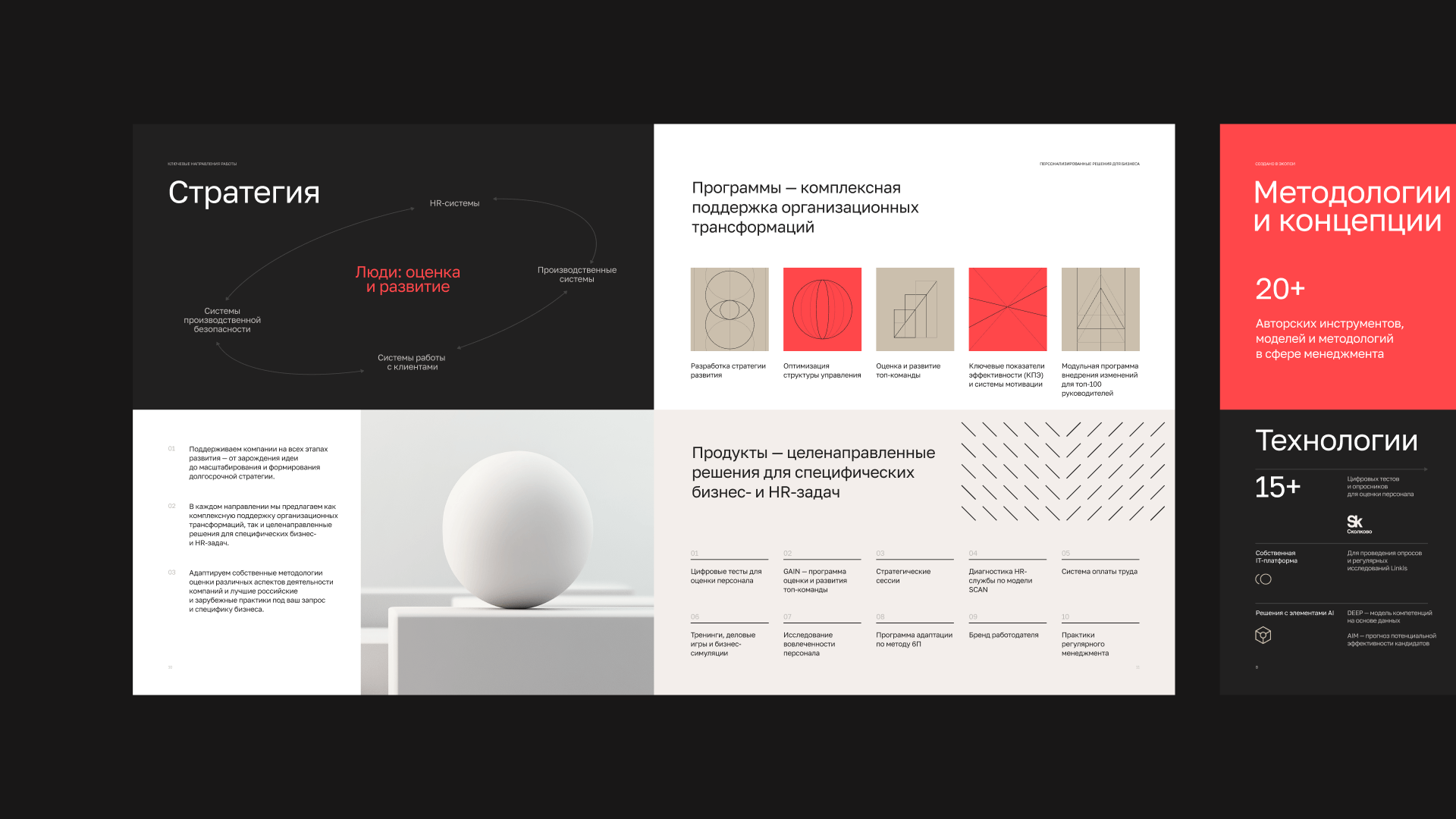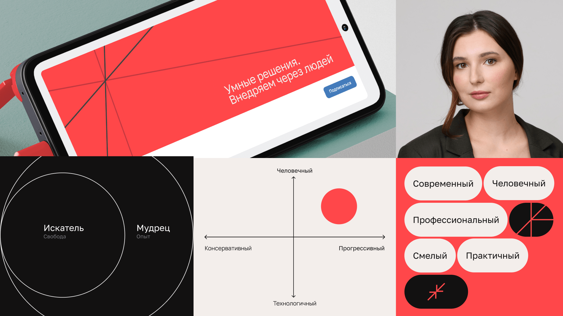 Цветовая гамма в основном состоит из чёрного, серого и белого цветов, а новым акцентным фирменным цветом стал коралловый. Он транслирует энергию, человечность и подчёркивает современный и проактивный подход. В дополнение к нему мы подобрали бежевые оттенки, которые помогают сбалансировать и смягчить палитру, создавая более спокойный и надёжный образ.