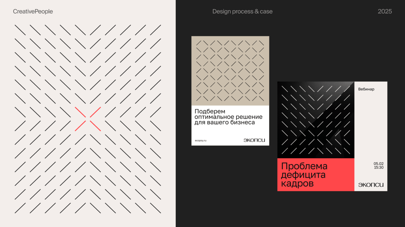 Одним из ключевых элементов предыдущего фирменного знака был слэш, подчеркивающий синергию экономики и психологии в работе компании. Клиенту было важно сохранить его, поэтому мы добавили этот элемент в новый паттерн, дав ему свежее прочтение в айдентике.
