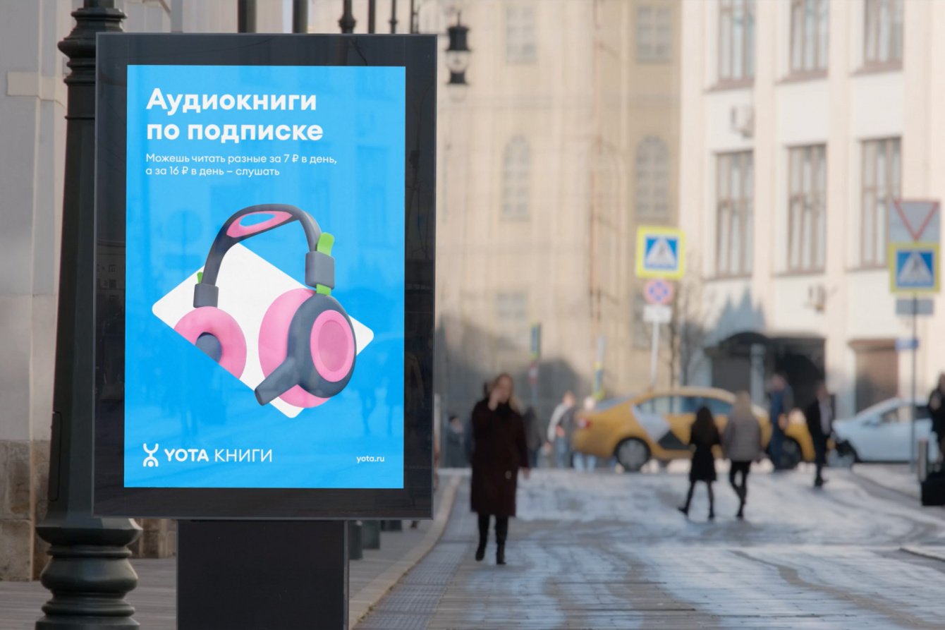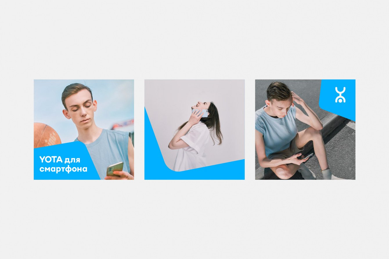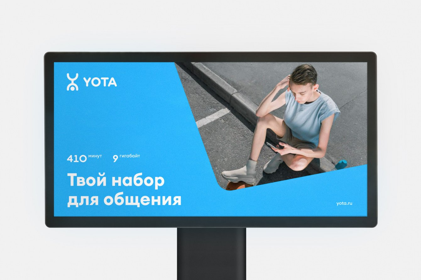 Бренд отсекает лишнее и фокусируется на сути. Мы разработали простой и динамичный символ — окно в виде смартфона — главного атрибута мобильного оператора. Оно открывает мир Yota для пользователя и помогает сфокусировать внимание зрителя на том, что предлагает бренд. Это может быть продуктовое предложение, тариф, девайс, а также слоганы и иллюстрации, которые выражают ценности бренда. В визуальных коммуникациях с помощью окна можно сделать акцент на всём, что важно: люди, предметы и надписи как бы выходят из него.
