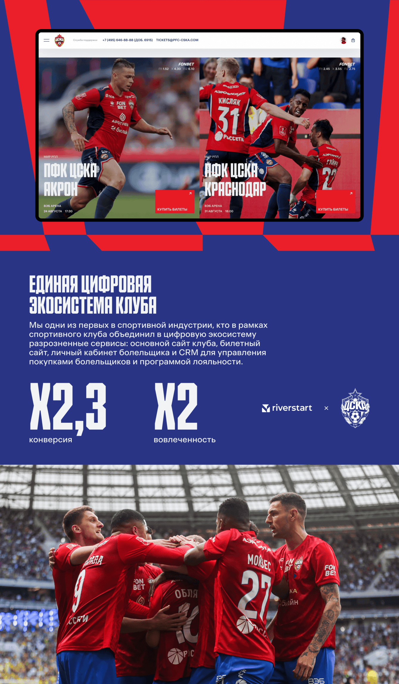 Мы создали единую цифровую экосистему ПФК ЦСКА, объединив основной сайт, билетный сервис, интернет-магазин, личный кабинет болельщика и CRM систему.