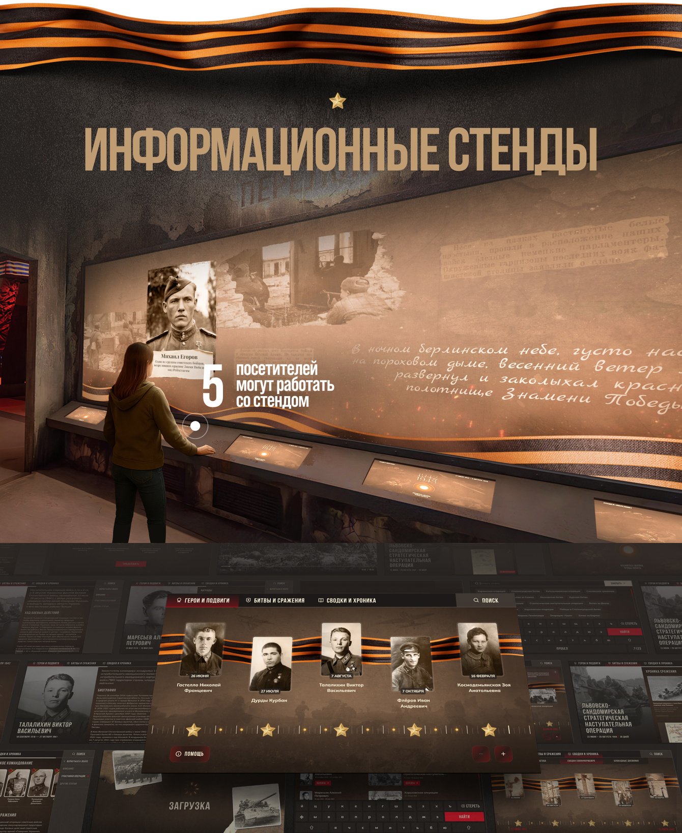 Мы спроектировали и реализовали систему, которая позволяет одновременно до 5 посетителям работать со стендом, управляя материалами на тач-экране. В четырёх залах, посвящённых разным периодам войны, посетители могут изучить исторические материалы на большом проекционном экране.