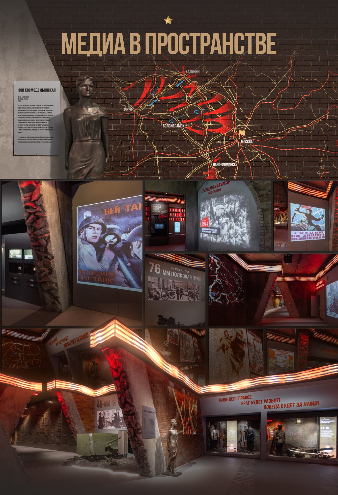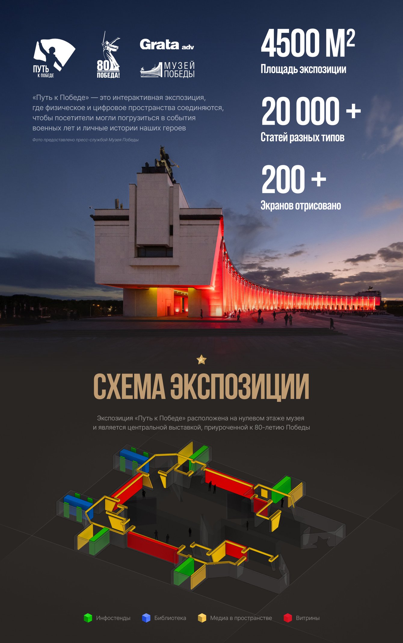 — Подготовлен motion-контент: анимации боевых действий на карте, фоновые видео и объёмная георгиевская лента длиной 280 метров, протянувшаяся через все залы.
