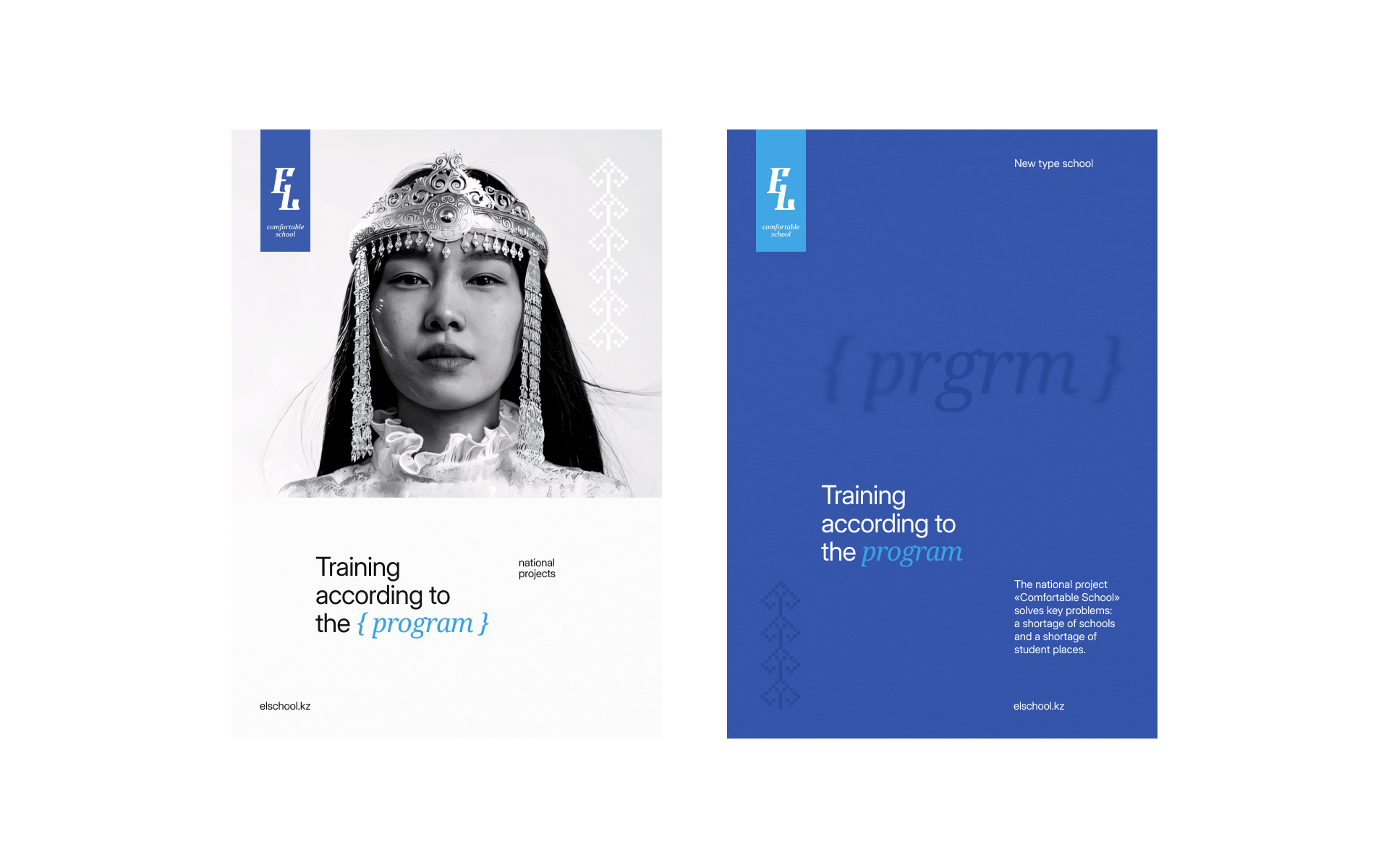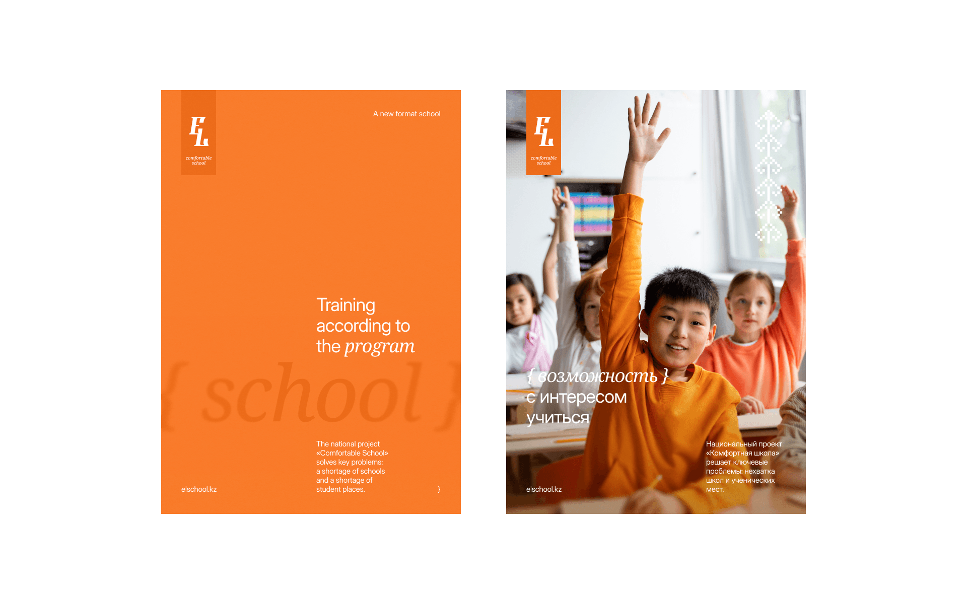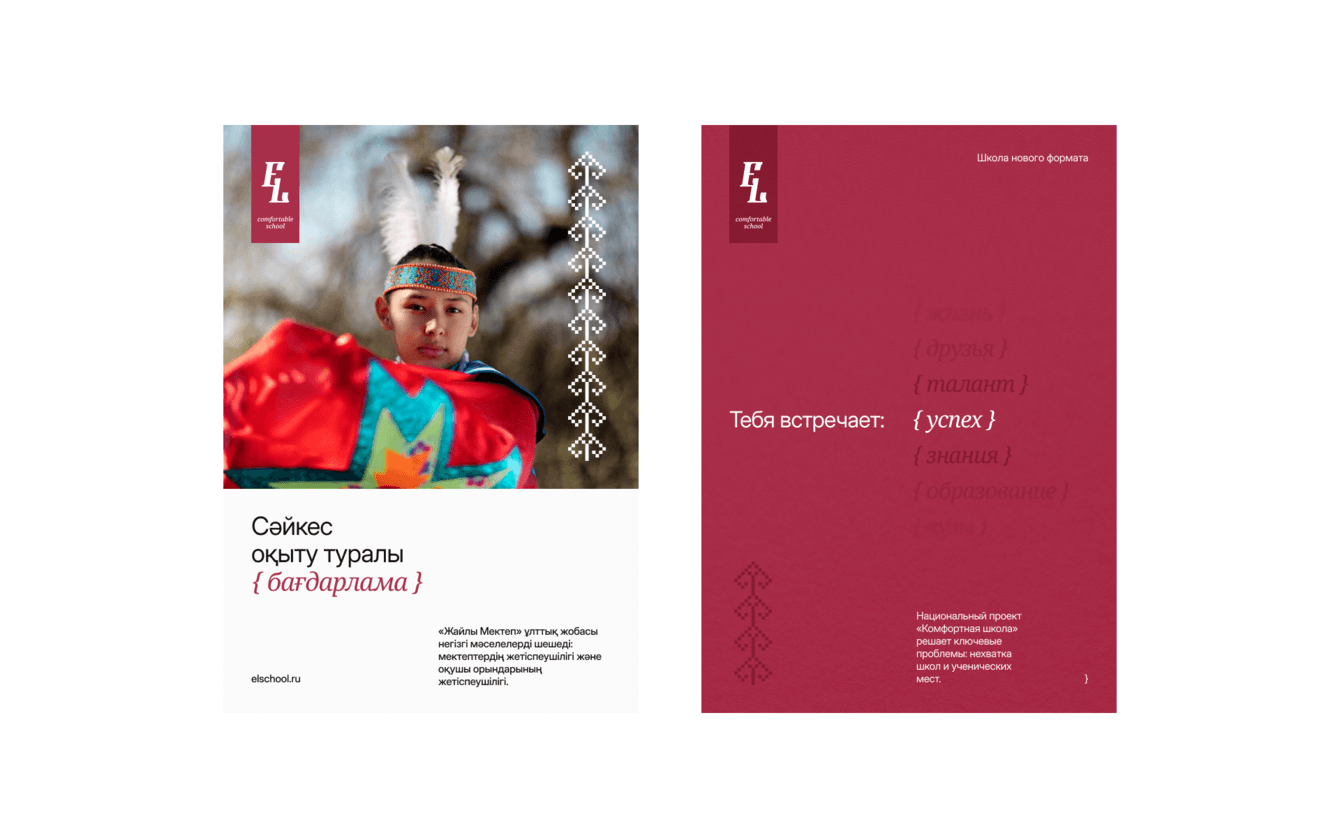 Сделали концепт фирменного стиля и проработали позиционирование — «комфортная школа». В основу логотипа взяли монограмму, а формы логознака отсылают к пластике народного орнамента. Так мы подчеркнули миссию школы — на принципах равности и доступности взрастить созидающих личностей на основе казахстанского культурного наследия и лучшей международной практики.