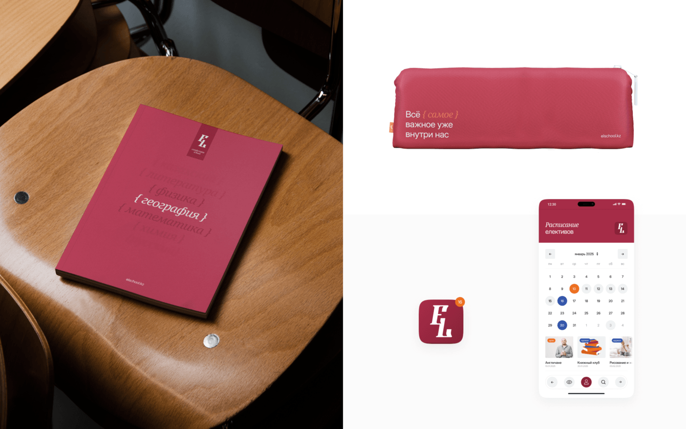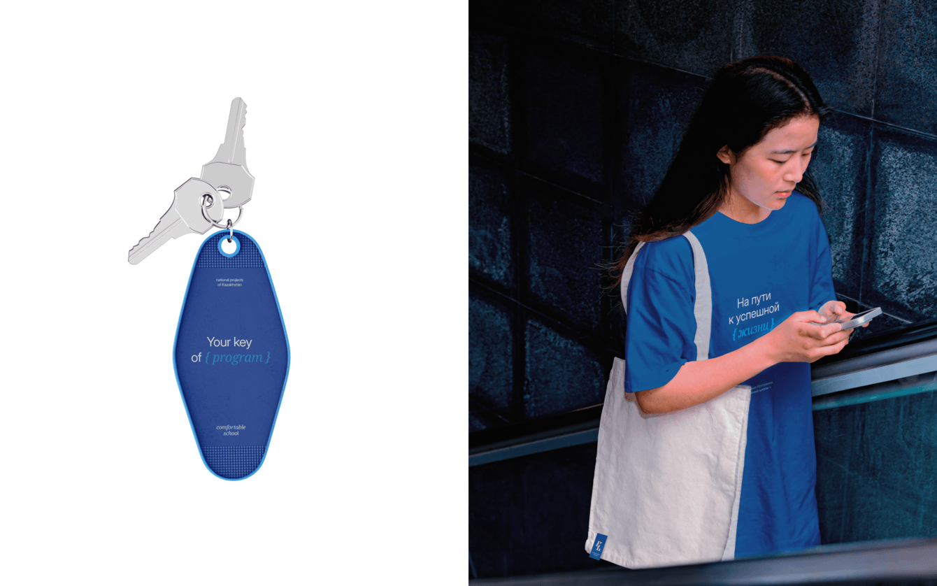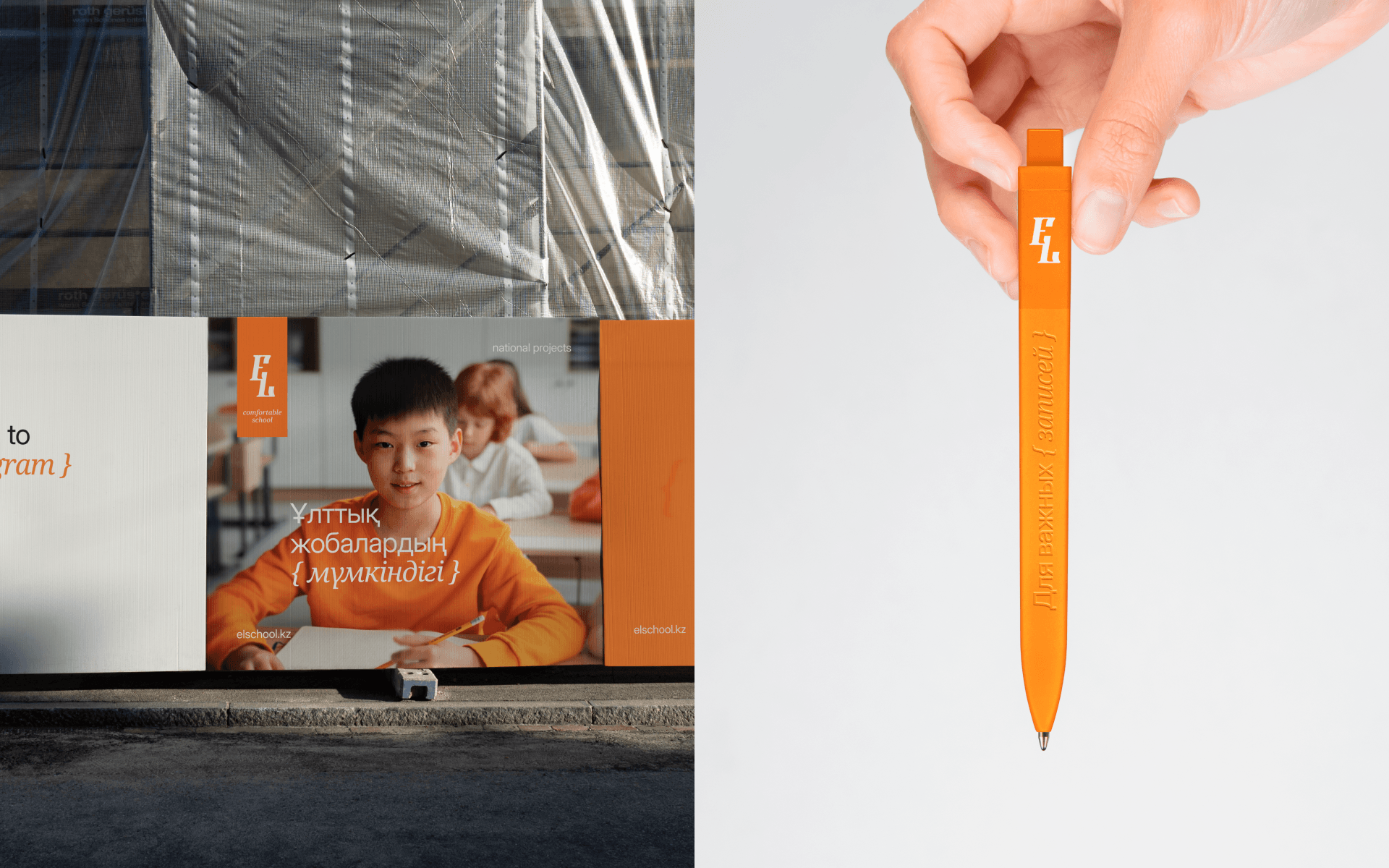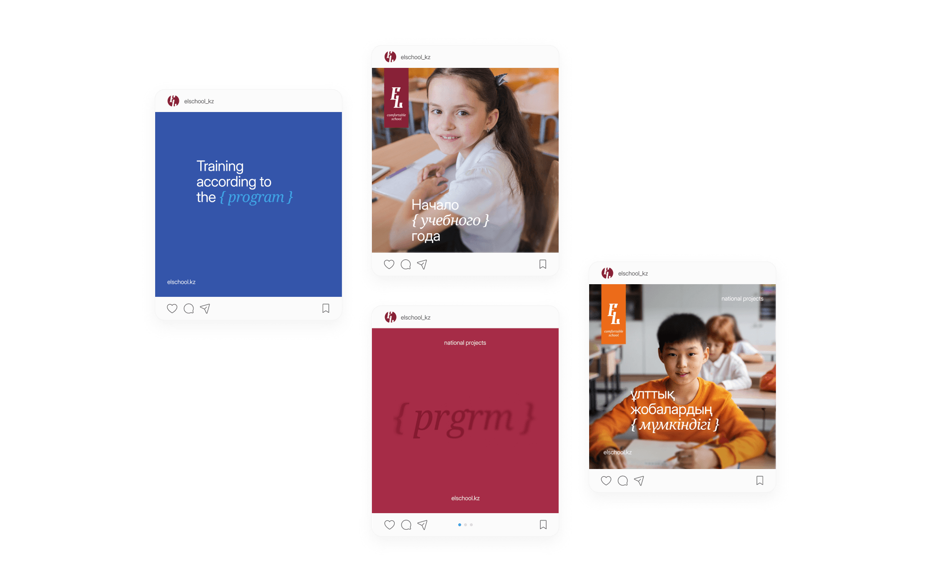 Сделали концепт фирменного стиля и проработали позиционирование — «комфортная школа». В основу логотипа взяли монограмму, а формы логознака отсылают к пластике народного орнамента. Так мы подчеркнули миссию школы — на принципах равности и доступности взрастить созидающих личностей на основе казахстанского культурного наследия и лучшей международной практики.