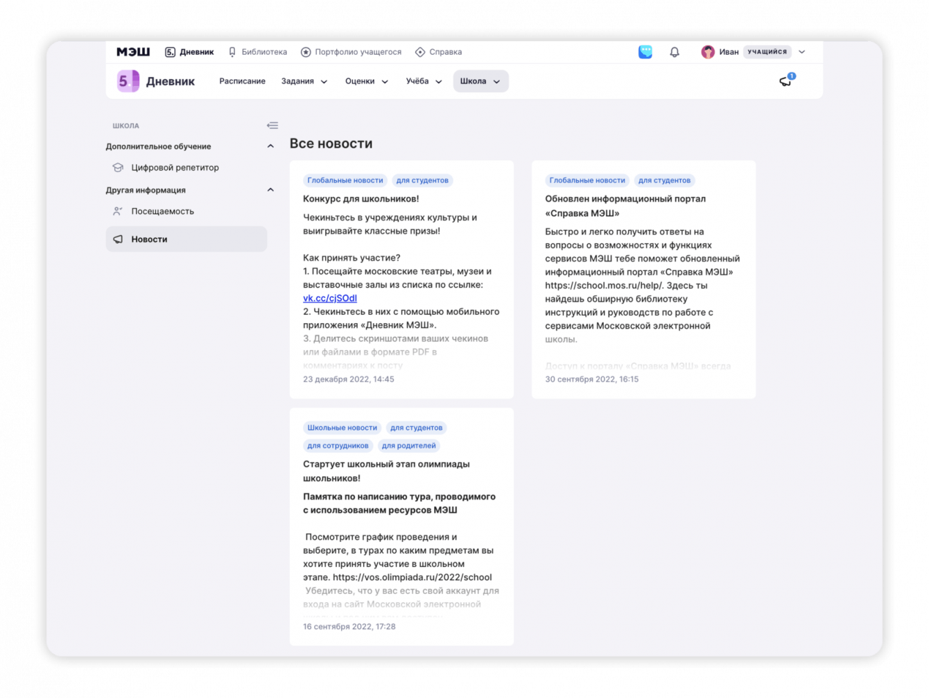 В разделе «Школа» публикуется информация о приближающихся контрольных работах, встречах, экскурсиях и других событиях. Каждое мероприятие или новость отмечены тегом, с помощью которого можно быстро найти интересующую вас информацию. Обо всех важных событиях будут приходить уведомления.