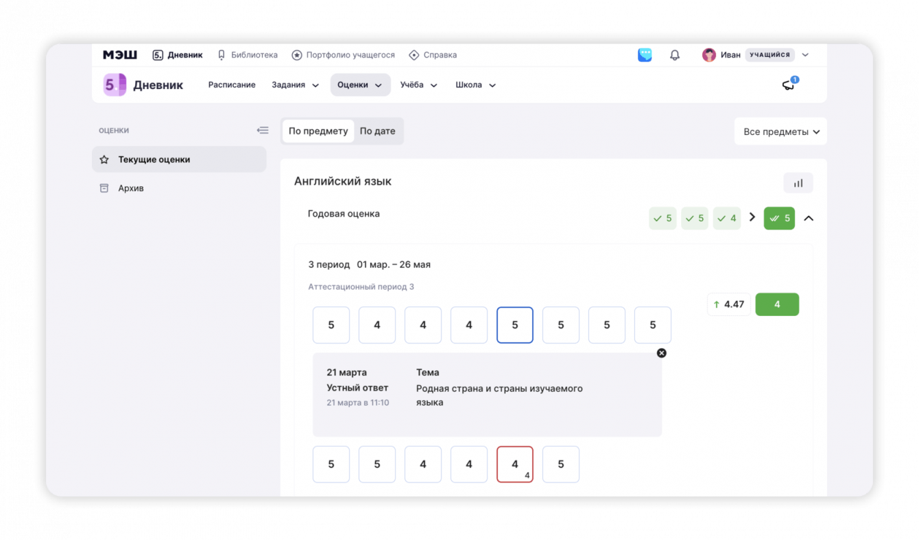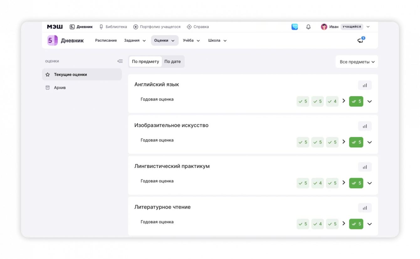 В разделе с оценками отображается успеваемость за текущий учебный год. Отметки можно отсортировать по предмету и дате, а также выбрать результаты оценивания по определенным дисциплинам.