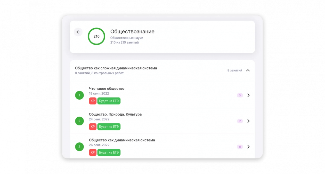 В расписании отображаются карточки уроков. Кликнув на них, ученик может увидеть подробную информацию: название и тему урока, ФИО учителя, номер кабинета, средний балл по теме и другие важные параметры занятия.