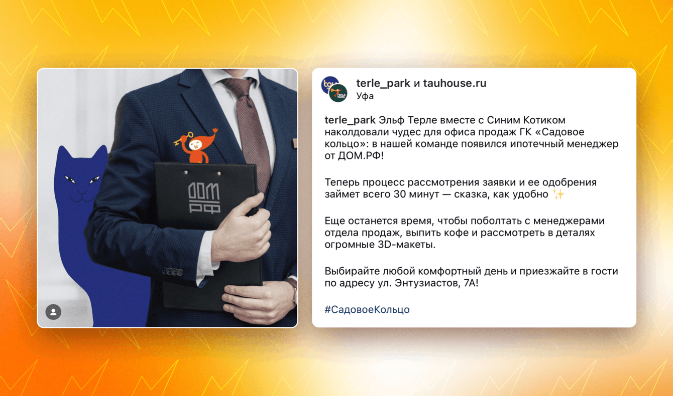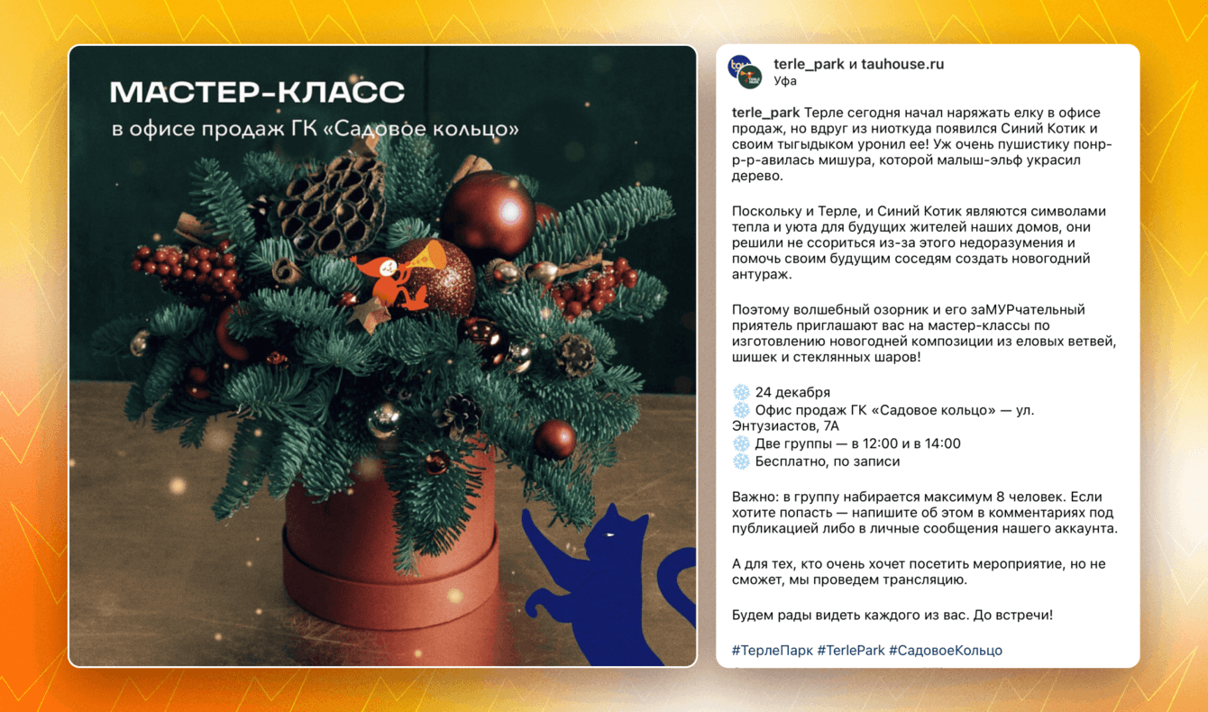 У девелопера есть еще один проект в Уфе — ЖК Tau House. Его соцсети более развиты и на них подписано больше горожан. С помощью совместных публикаций привлекали целевую аудиторию в аккаунты Terle Park.