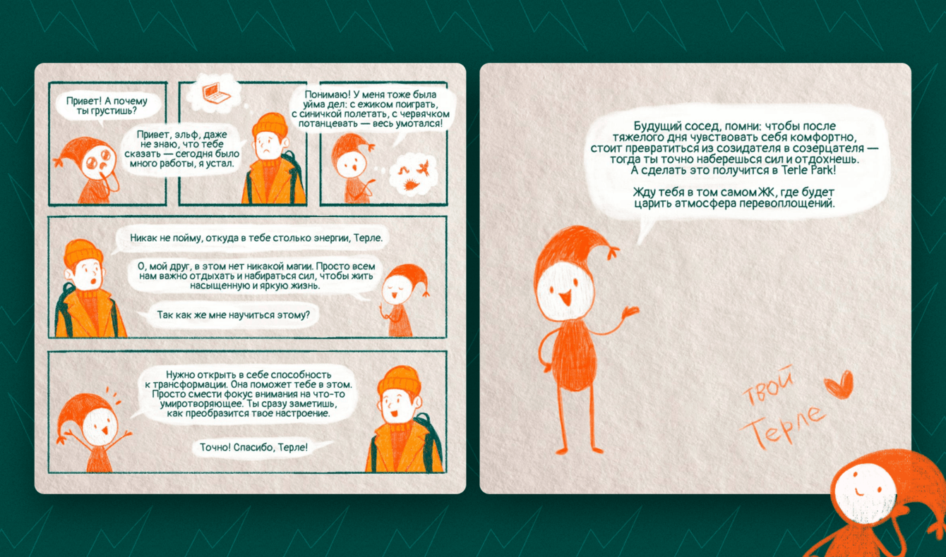 «У каждого своя сказка» — слоган жилого комплекса. Мы отталкивались от основной идеи, поэтому в дизайн внедряли этнические образы и элементы, ассоциирующиеся с волшебством. А тексты писал волшебный эльф Терле — маскот проекта. P.S.: мы настолько к нему привыкли, что хотим верить, что он существует!