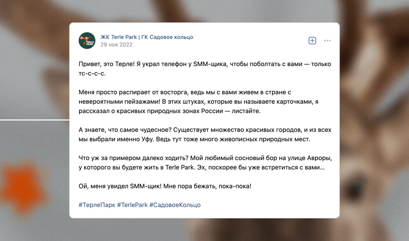 Эльф Терле — дух леса, рядом с которым строится Terle Park. Если в текстах для ВКонтакте и Instagram* мы говорили о персонаже в третьем лице, то Telegram-канал вели от первого. В нем Терле делился сказочными историями, шутил и простым языком рассказывал о деталях проекта.