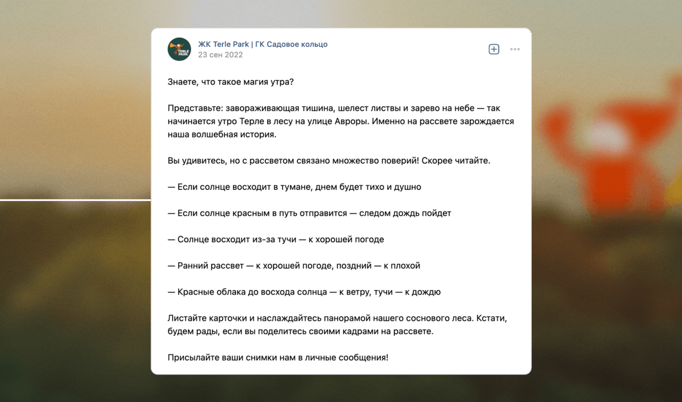 Лайфстайл-посты стали нашим проводником к сердечкам подписчиков. В фановой манере мы рассказывали интересные истории, делились необычными фактами, мягко добавляя в контент преимущества Terle Park.