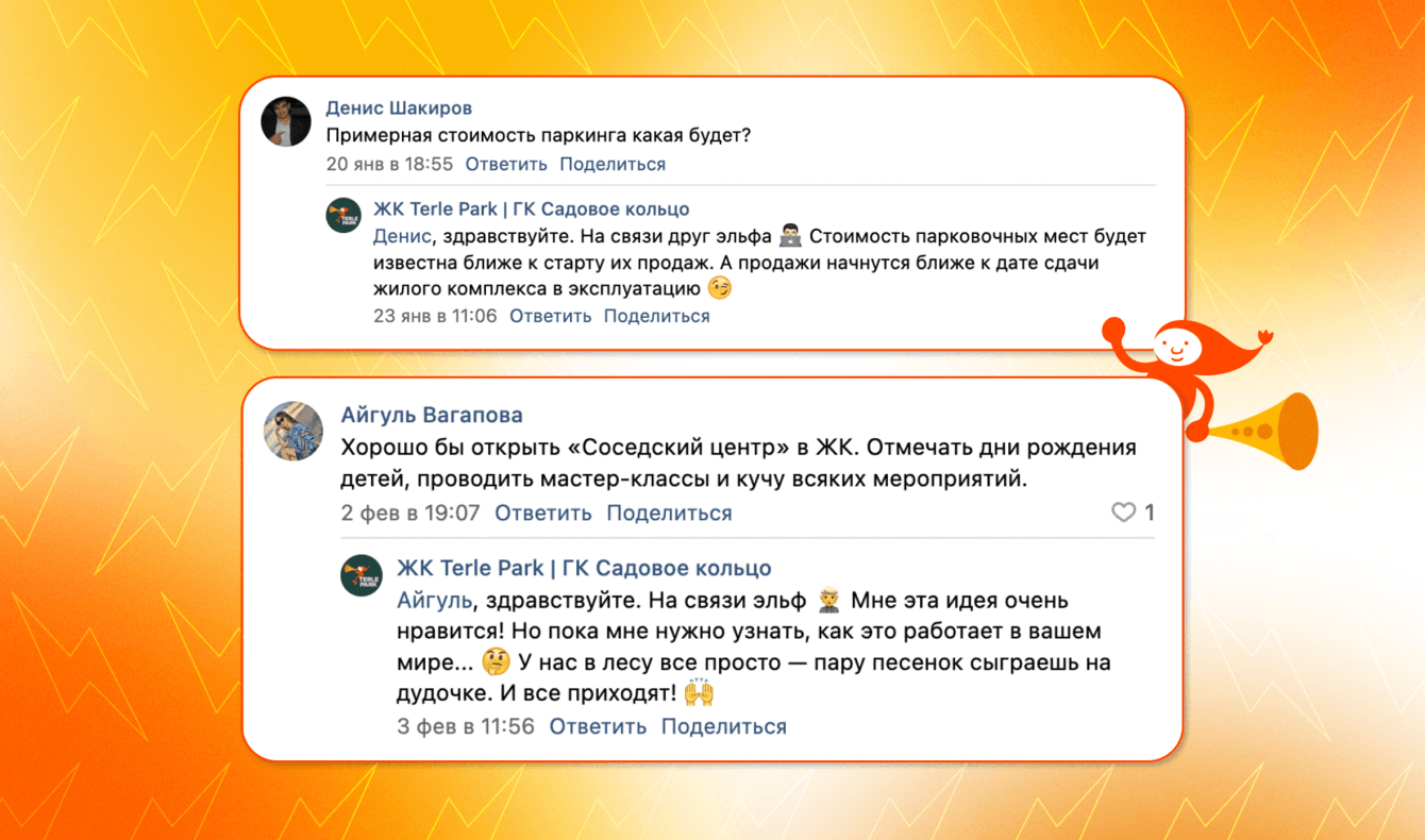 Мы придерживались следующей стратегии: на вопросы, связанные с технической составляющей проекта, отвечали от лица бренда — экспертно и по делу. А все, что касалось атмосферы, инфраструктуры и обратной связи, комментировали от лица эльфа Терле — задорно, весело и мило.