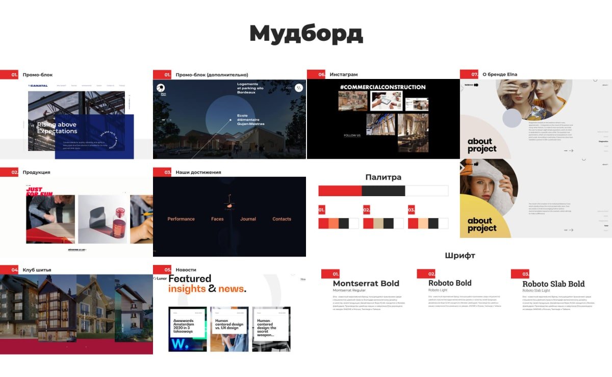 Надо было найти и использовать визуальные решения, которые не были задействованы в первом проекте. Хотелось каких-то новых фишек для блоков. Мы провели брейншторм и решили, что оптимальный вариант в этом случае — сделать дополнительные мудборды (визуальные брифы) с упором на фишки для каждого из блоков главной страницы. Традиционно визуальный бриф мы готовим для всей дизайн-концепции, перед разработкой прототипа, и актуализируем перед стартом дизайна главной страницы. В этом проекте у нас получился набор мудбордов, которые мы соединили воедино.