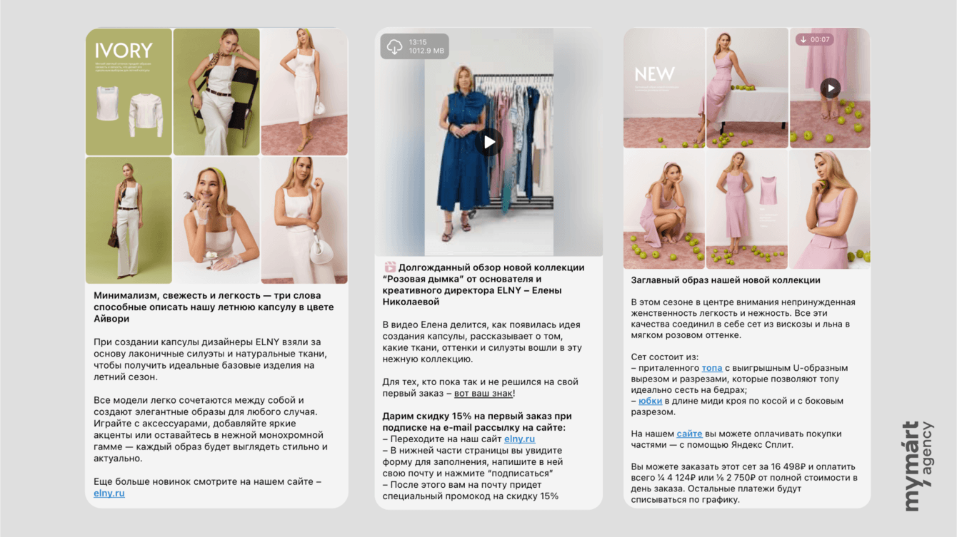Частая проблема брендов женской одежды – отсутствие прочной связки продакшна и SMM: съемки продюсируются без акцента на дальнейшее их использование на разных площадках бренда. Из-за этого контент не прорабатывает возражения аудитории и не отличается от конкурентов.