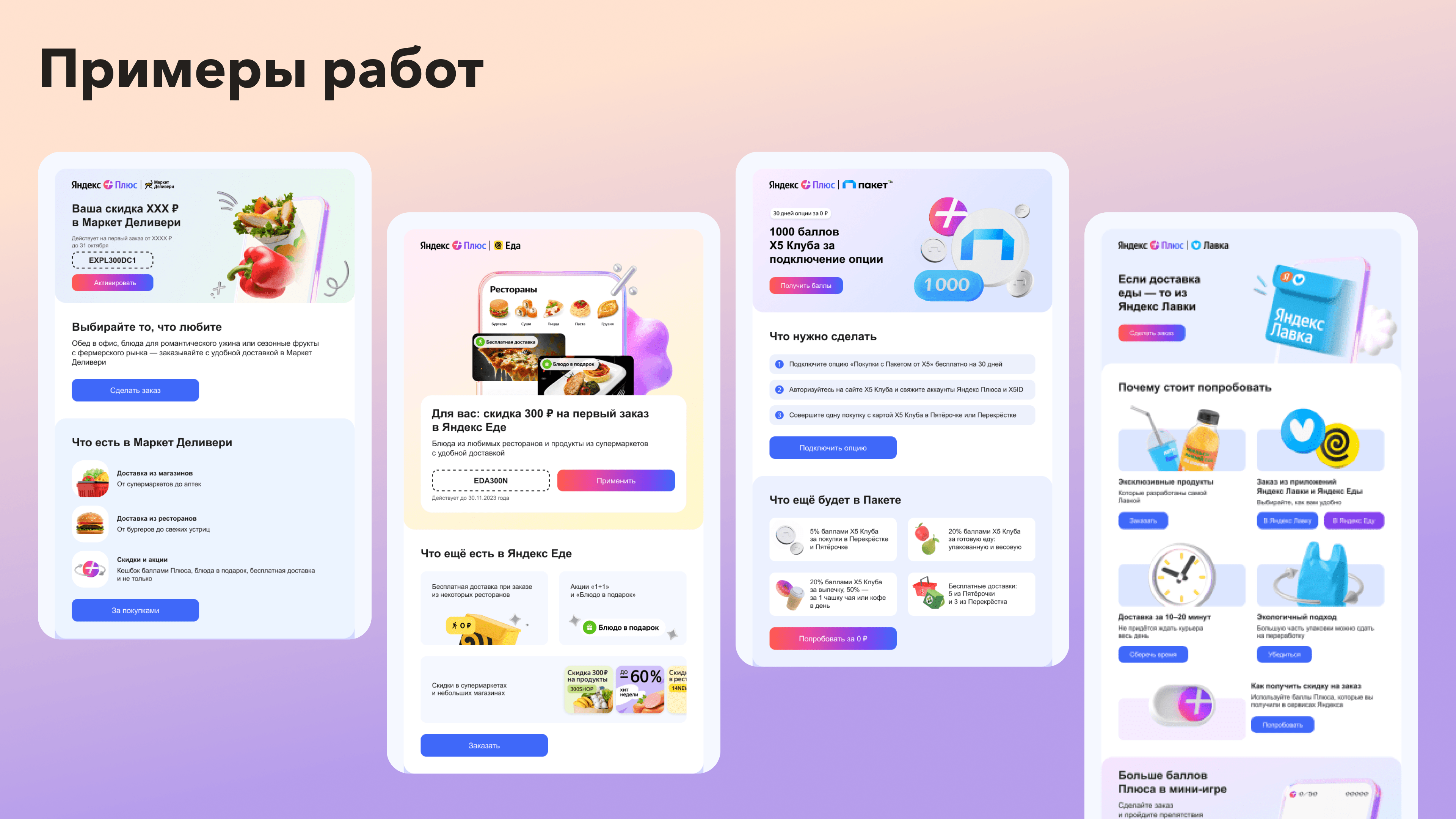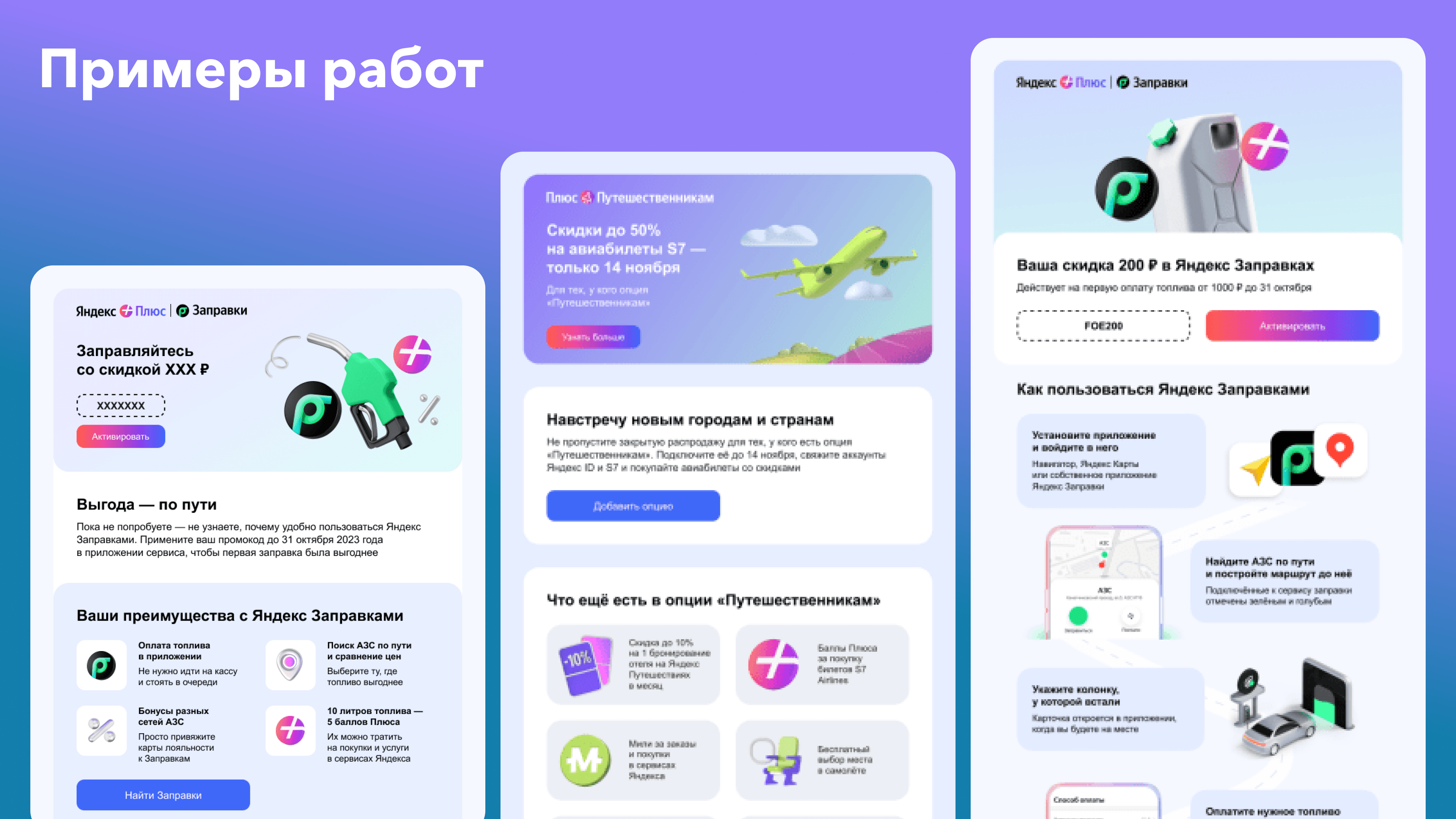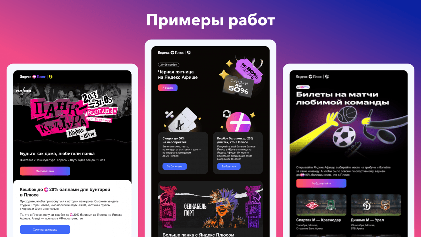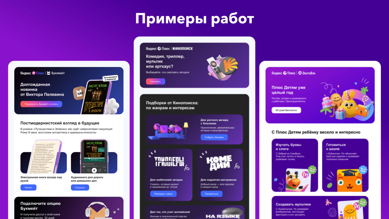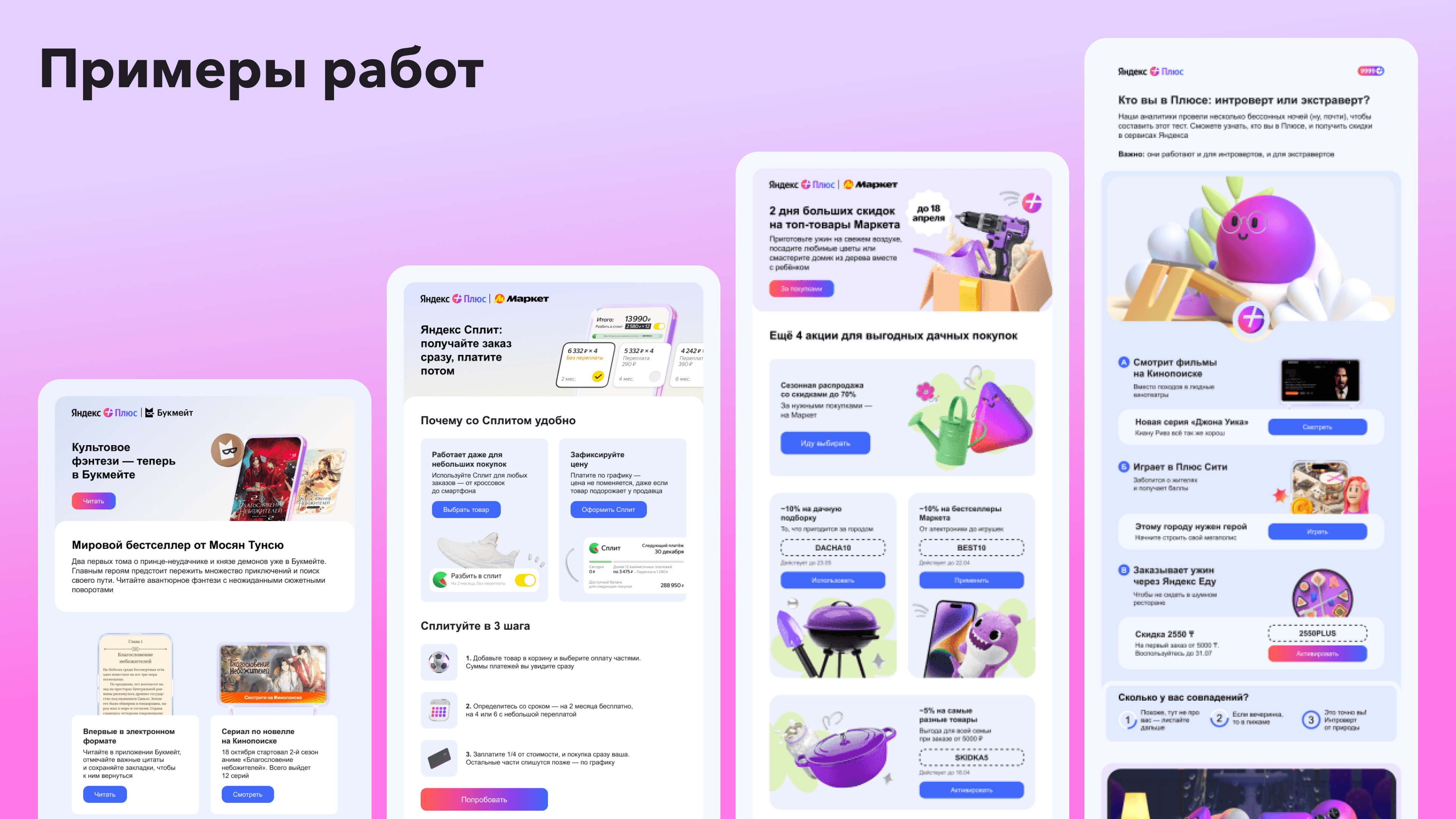 До декабря 2023 года мы подготовили 220 email-рассылок под ключ. С января 2024 года редакция Яндекс Плюса пишет тексты самостоятельно. На нашей стороне — создание креативных макетов для триггерных и промо-email-коммуникаций, а также их вёрстка.