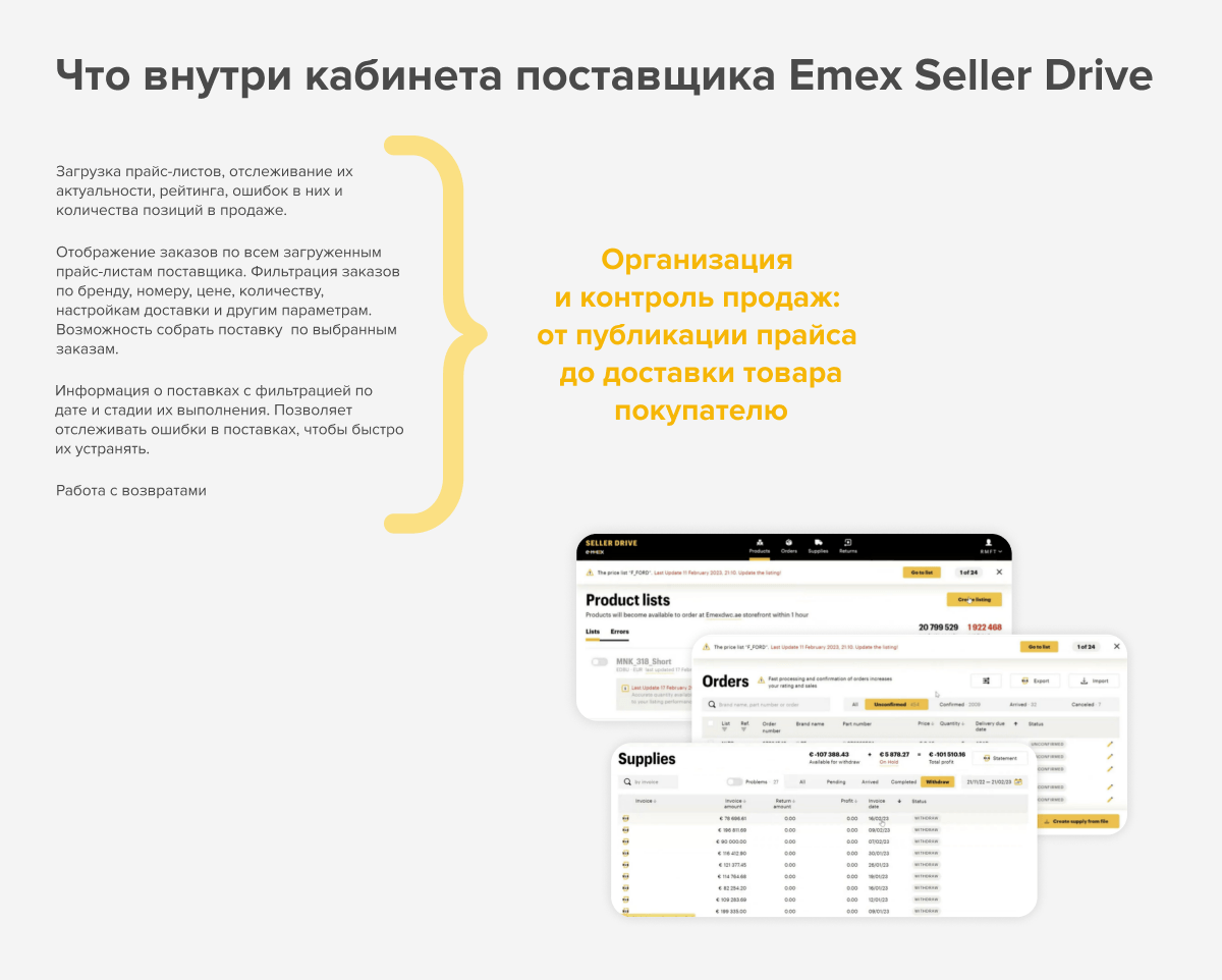 Seller Drive — это система Emex DWC для работы с поставщиками – их личный кабинет. Он выступает своеобразным мостиком между поставщиком автозапчастей и их заказчиком. Нам предстояло создать новую версию Seller Drive взамен той, что существовала в компании последние 10 лет и не обновлялась 7 из них.