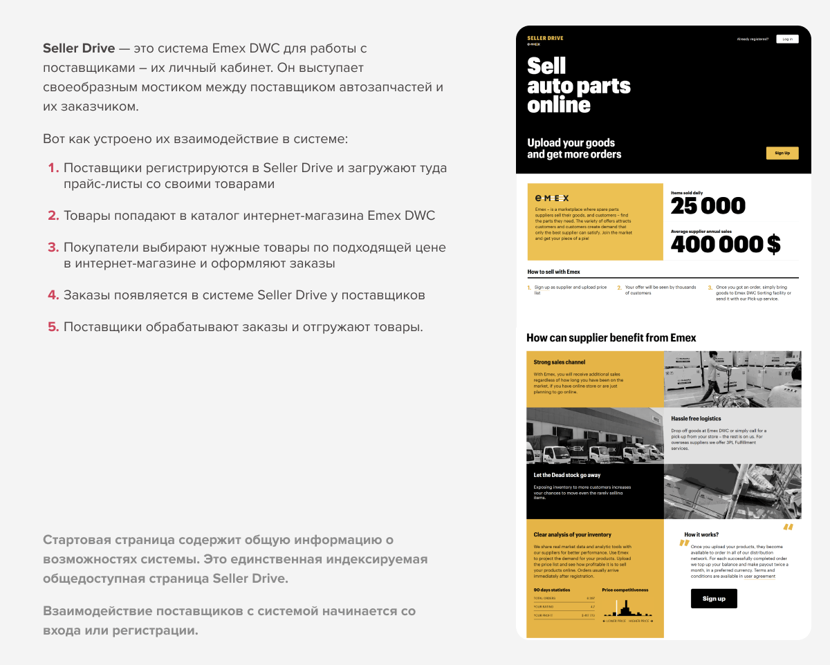 - провести анализ и зафиксировать все актуальные бизнес-процессы Emex, затрагивающие систему Seller Drive и работающих с ней людей — поставщиков и менеджеров;